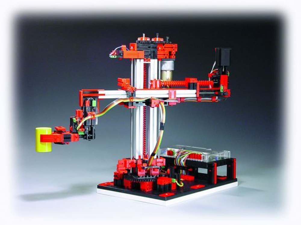 3D манипулятор в сборе с захватным устройством, моторами 24 В и контактными датчиками. Модель предназначена для захвата и перемещения заготовки в заданную точку пространства. Захват следующей заготовки осуществляется после возврата манипулятора в исходное положение. Модель установлена на устойчивом основании из ДСП.