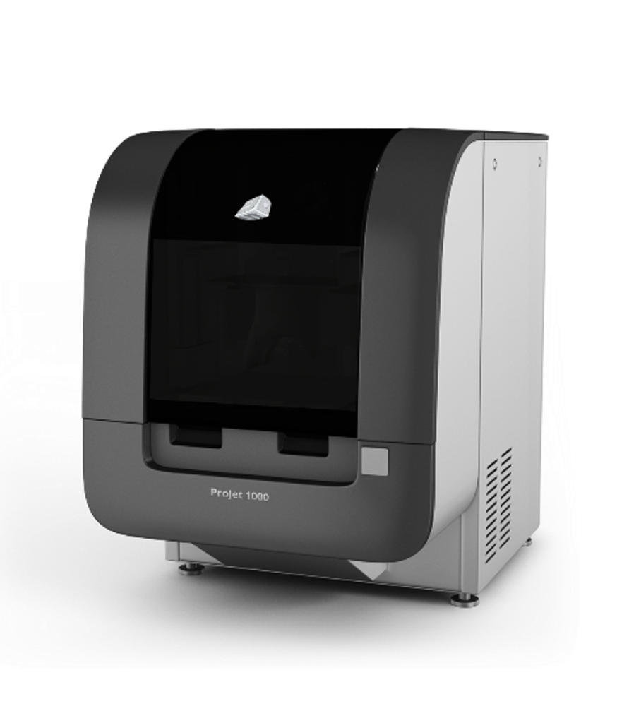 3D-принтер ProJet 1000 объединяет в себе профессиональное качество 3D-печати и выгодную цену. Печать осуществляется с толщиной слоя всего 0,102 мм, разрешением 1024x768x250 dpi по осям XxYxZ и минимальной погрешностью. Скорость печати составляет 12,7 мм в час. Область построения равна 171x203x178 мм.