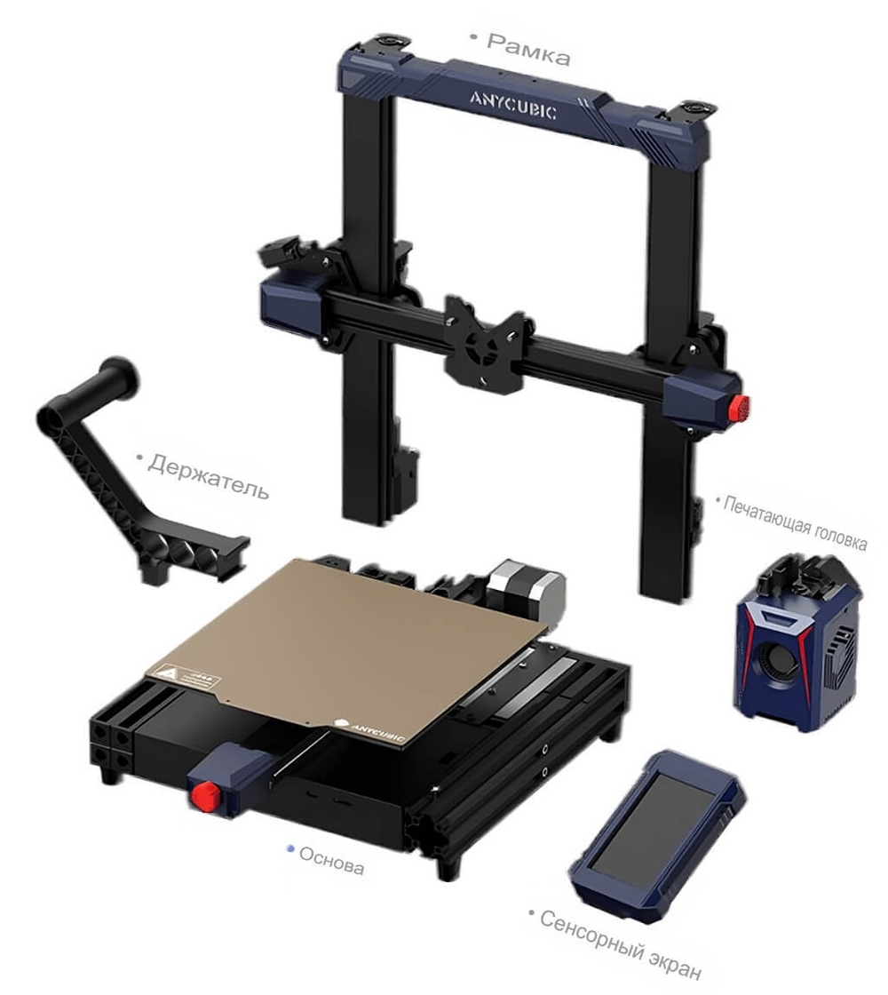 Anycubic Kobra 2 поставляется в виде DIY-комплекта. Основание и рама составляют большую часть содержимого коробки. также в комплект входят: печатающая головка, сенсорный жидкокристаллический дисплей, датчик филамента, держатель катушки, материалы для сборки, необходимые инструменты и кабель питания. В комплект поставки также входят карта microSD, устройство для чтения карт памяти и некоторое количество пластика PLA.