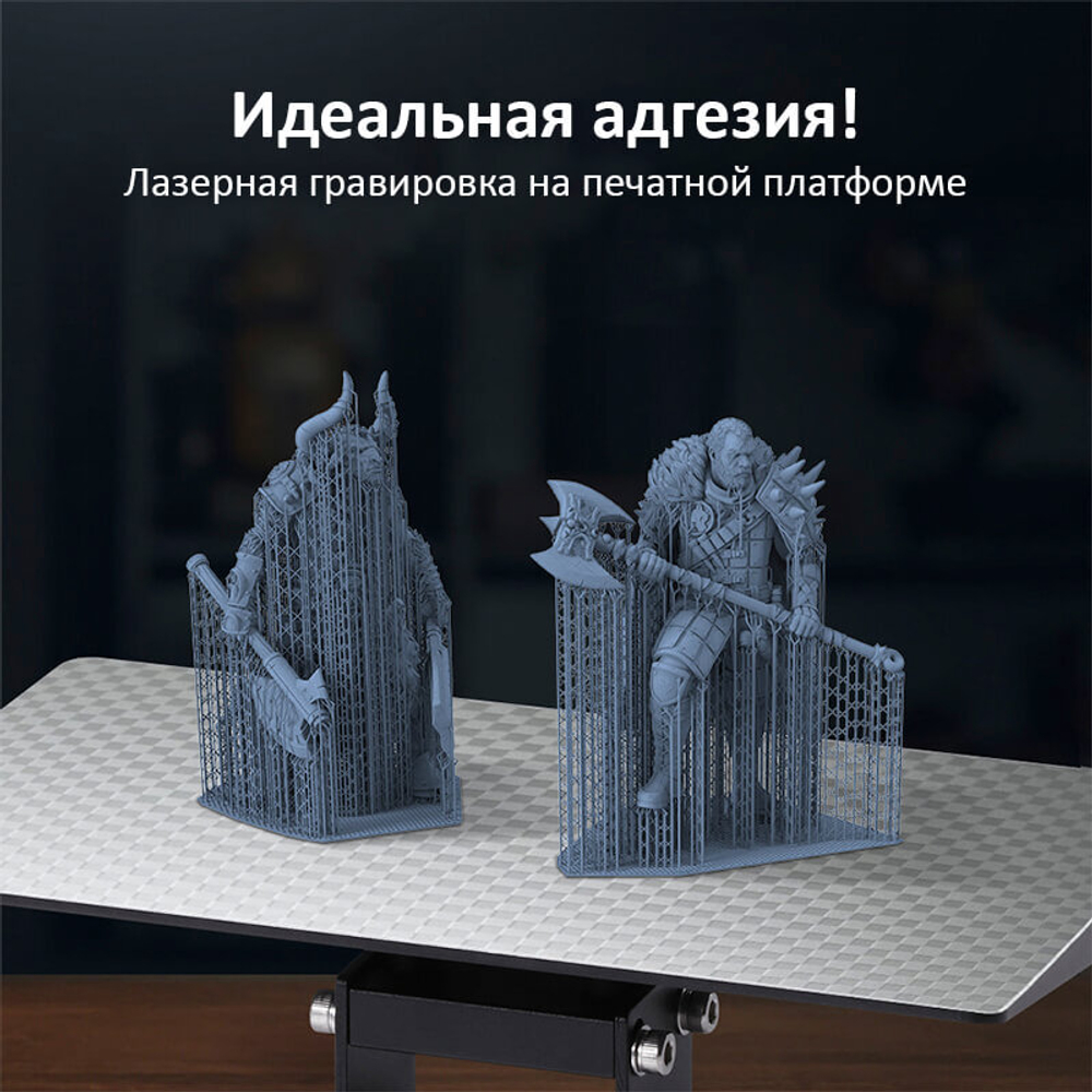 Благодаря лазерной гравировке на платформе для печати, Photon Mono M5 обеспечивает идеально плоскую поверхность и хорошую адгезию моделей сравнительно с платформами с пескоструйной обработкой. Это значительно улучшает сцепление модели, снижает вероятность отслоения и деформации, а также радикально повышает процент успешных печатей.