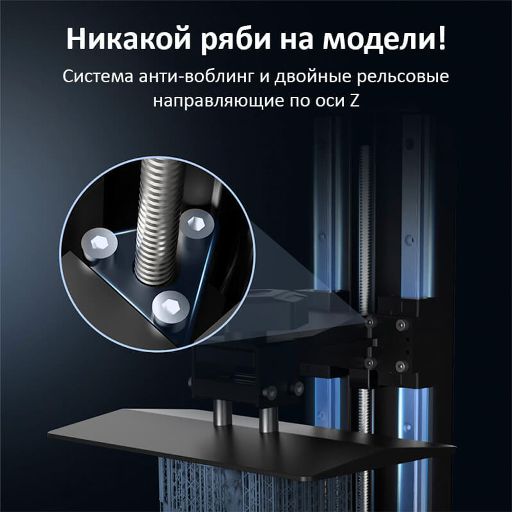 Применение высокостабильных и точных двойных линейных направляющих по оси Z с винтовой осью в сочетании с износостойкой гайкой POM обеспечивает микроуровень точности в работе оси Z без вибраций. Это эффективно устраняет рябь на моделях и подчеркивает красоту деталей.