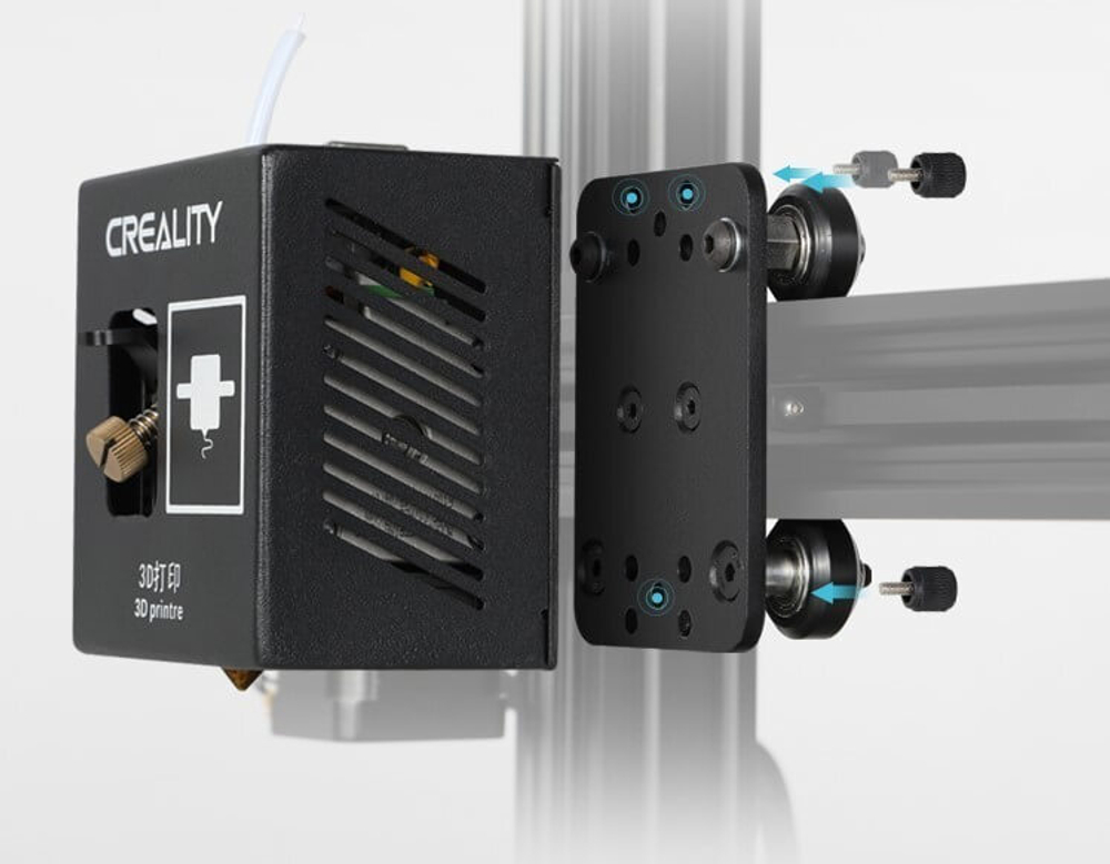 П-образная рама с подвижной планкой выполнена из экструдированного алюминия. В её верхней части расположены два электромотора, которые синхронно обеспечивают движение этой планки. Ещё один мотор находится слева. Он отвечает за перемещение посадочного места, к которой крепится сменное оборудование. Это оборудование - самая интересная “фишка” Creality CP-01!