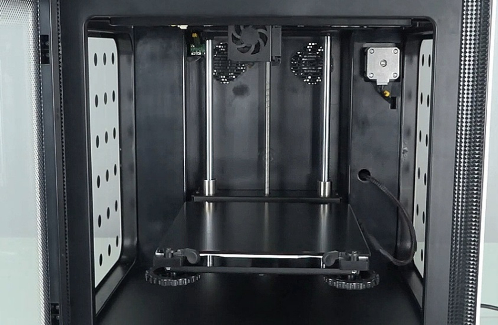 Область построения у принтера небольшая, но достаточная для домашних DIY-проектов – 200×200×200 мм. Область печати полностью закрыта, а это означает, что внутри поддерживается качественная терморегуляция. Это необходимо для более чёткой печати, а для ABS и подобных ему пластиков является насущной необходимостью. Зона печати имеет приятную LED-подсветку.