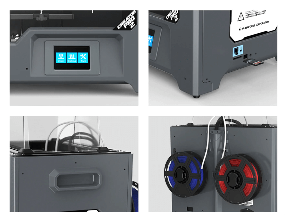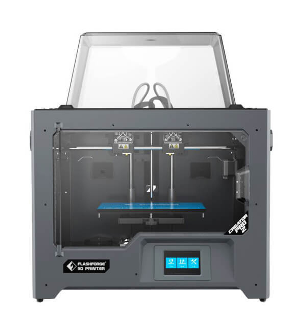3D принтер FlashForge Creator Pro 2 на первый взгляд похож на своего предшественника с двумя соплами, но на самом деле он обладает куда большими возможностями. В нём реализована полноценная система независимого двойного экструдирования (IDEX). Она позволяет не просто печатать двумя материалами, а вести одновременную печать сразу двух разных объектов! Это даёт доступ ко множеству новых режимов печати, которые были недоступны оригинальному Pro. Благодаря своим большим возможностям принтер может решать сложные задачи в домашней 3Д-печати, в образовании и даже в производстве.