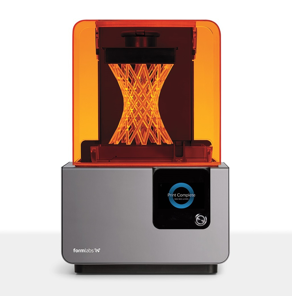 Form 2 принтер от компании Formlabs, использующий не экзструзию – послойное наложение расплавленного пластика, а лазерную стереолитографию – объект формируется тончайшими слоями из смолы, фотополимеризующейся под действием лазера, что обеспечивает высочайшую точность печати в 25 микрон. Проекты получаются очень гладкими и почти не нуждаются в последующей обработке, а благодаря высокому качеству печати, Вы можете создать модель, до мельчайших деталей соответствующую цифровому образцу.
