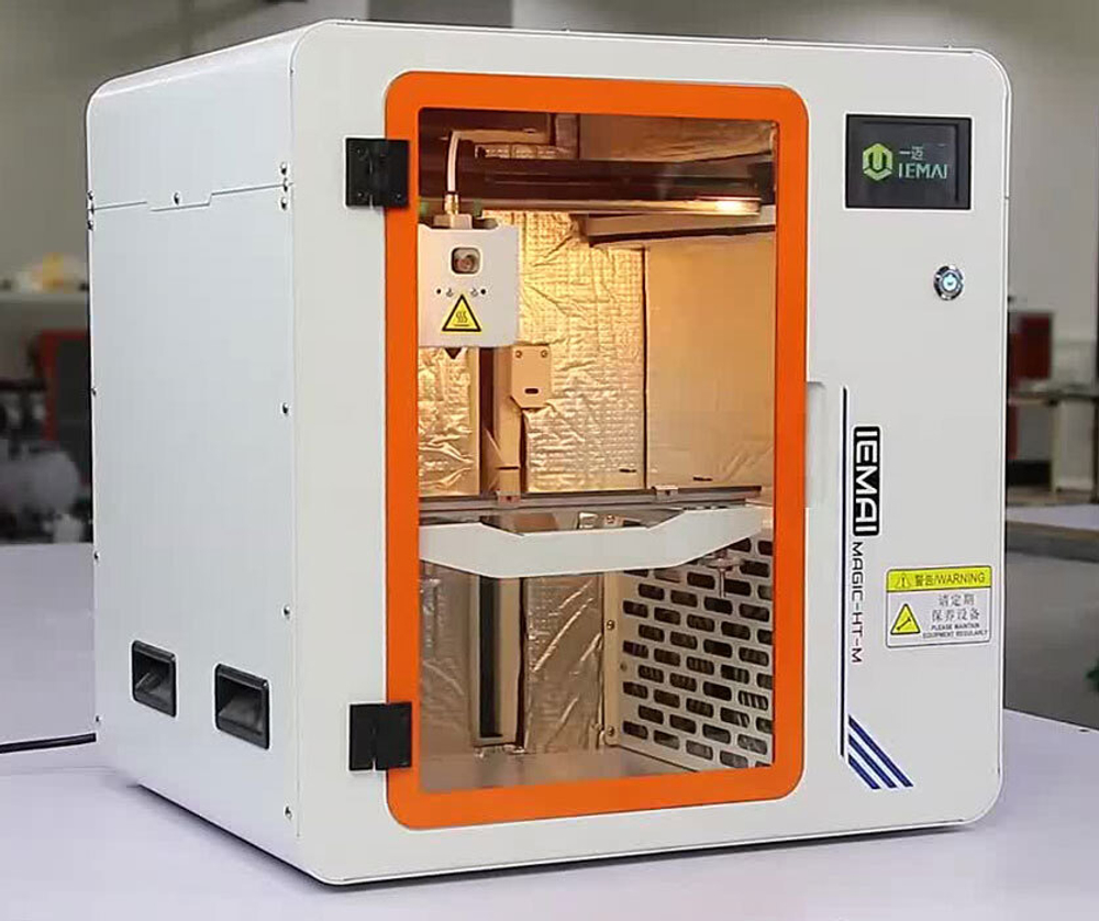 Оснащённый надёжным металлическим корпусом, этот принтер имеет габариты 505×435×515 и вес 35 кг. Его область построения с размерами 220×220×220 мм является не просто закрытой, а представляет собой герметичную термокамеру. Внутри поддерживается заданная температура до 90 градусов. Как и другие модели этой линейки, MAGIC-HT-M получил качественный фильтр с активированным углём для очистки воздуха от испарений при плавлении пластика.