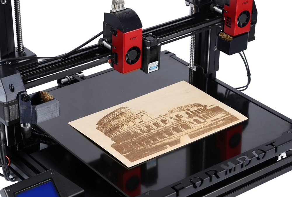 Новый 3D принтер сочетающий в себе еще и станок ЧПУ. Огромная область печати(400 x 400 x 500 мм), подогреваемый стол с отдельным блоком питания, две независимо друг от друга печатающие головки, подтекатели для пластика, экструдеры с максимальной температурой в 350 градусов, лазер для гравировки - все это в новом 3D принтере 2017 года Prusa FORMBOT.