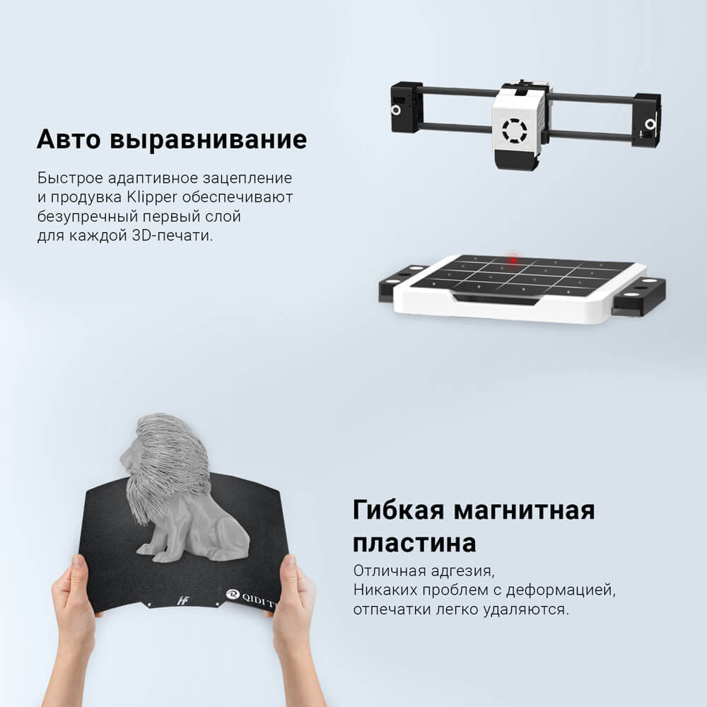QIDI Tech X-Smart 3 имеет систему автоматического выравнивания печатной платформы, которая помогает быстро подготовить принтер к печати и получить идеальный первый слой. Выравнивание происходит по 16 точкам, что позволяет обнаружить и компенсировать любые недостатки плоскости.