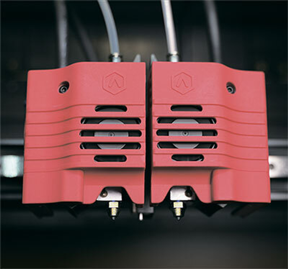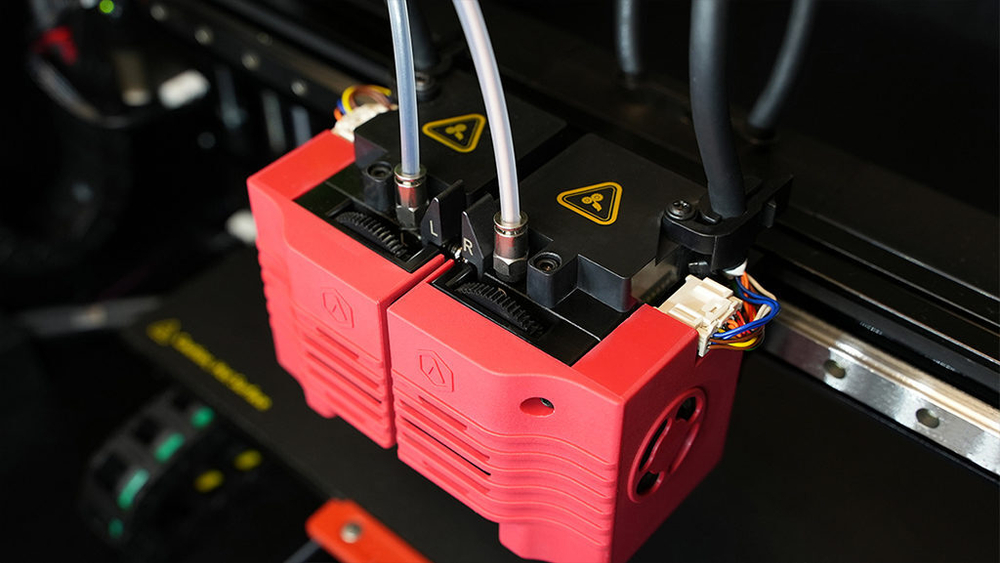 3D принтер Raise3D E2 CF создан на базе технологии IDEX, с двумя независимыми экструдерами, которая предоставляет пользователям ряд преимуществ по сравнению с классической компоновкой сдвоенного экструдера.