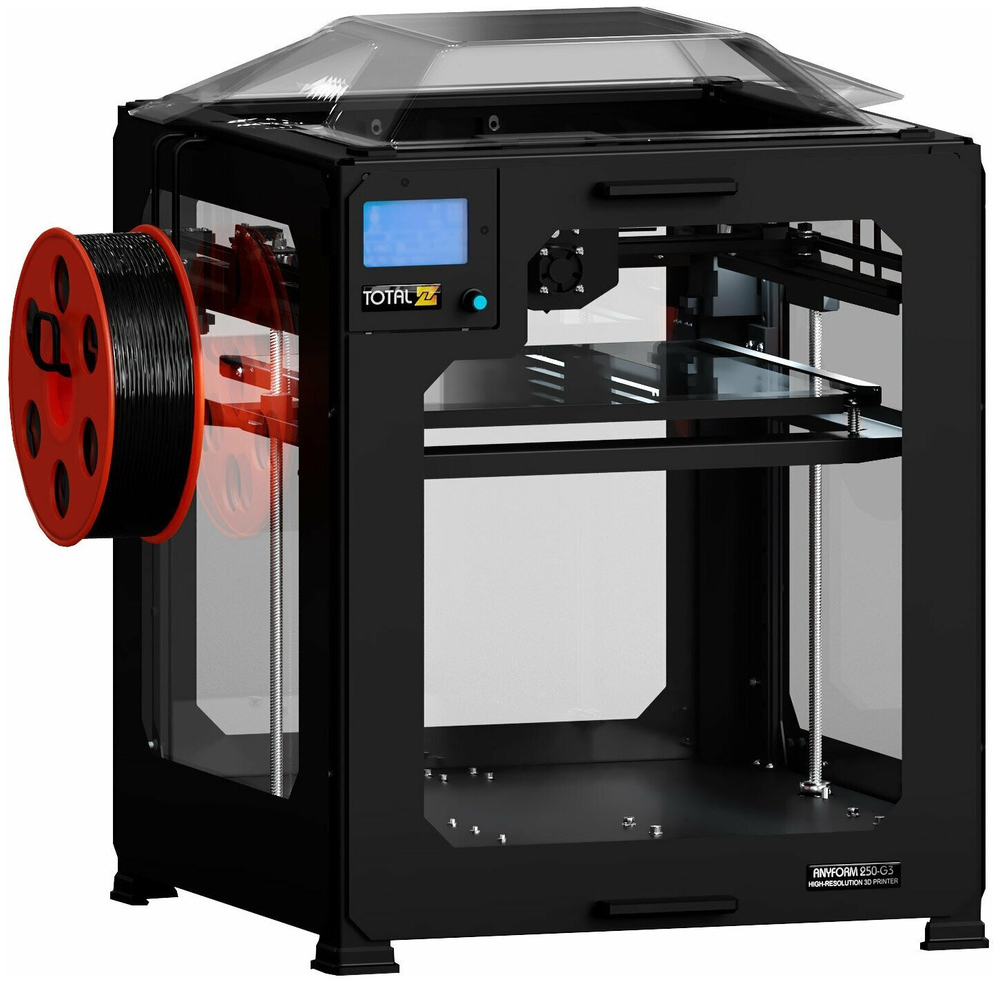 Принтер имеет жёсткую металлическую раму, которая сохраняет неподвижность даже при максимальной амплитуде движения печатающей головки. Это гарантирует высокую точность позиционирования и, как следствие, точность и стабильность самой печати. В этой модели применяется отлично зарекомендовавшая себя кинематика H-Bot, четыре рельсовых направляющих печатной платформы марки Hiwin, три рельсовых направляющих для печатающей головки и два ходовых винта по оси Z. Большим преимуществом механики Anyform 250-G3 является полное отсутствие пластиковых деталей в её узлах, что повышает прочность и надёжность. Всё это делает работу принтера точной и экономичной. Катушку с филаментом можно установить как с правой, так и с левой стороны корпуса, а пластиковая нить продевается через тефлоновую трубку в экструдер.