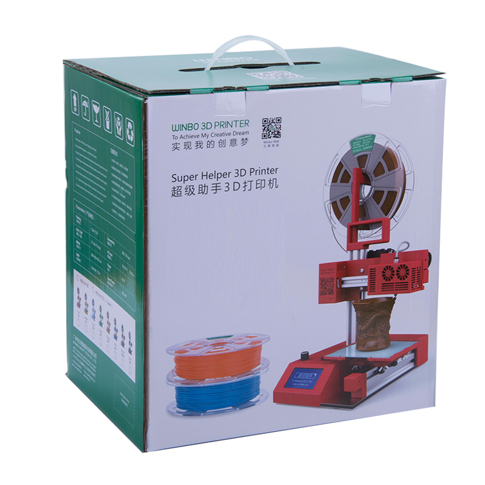 Представляем вашему вниманию компактный 3D-принтер с открытой конструкцией Super Helper SH105 от Winbo. Бюджетный и функциональный, Super Helper идеально подойдет для дома, школы, творческих студий, небольших производств. Его можно использовать для изготовления игрушек, домашних аксессуаров, корпусов для телефонов, макетов зданий и многого другого. Специальная рукоятка и небольшой вес (3,6 кг) делают его невероятно удобным для транспортировки. Скорость печати варьируется от 50 до 100 мм в секунду, а толщина печатного слоя – 0,04-0,25.
