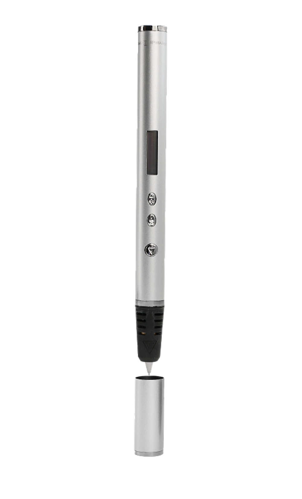 Компактная и лёгкая 3D ручка Myriwell RP900A для творчества и моделирования, выполнена в стильном алюминиевом корпусе серебристого цвета.