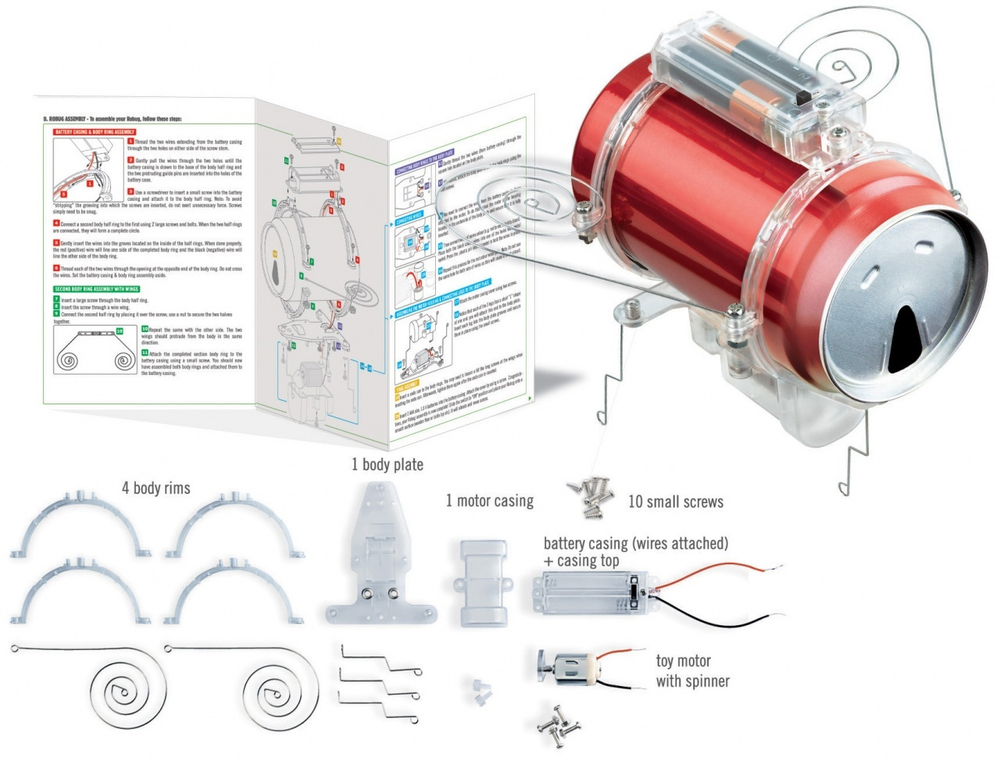 При работе двигателя робот издает жужжащий звук. Это резонирует воздух в пустой жестяной банке. Посмотрите, что произойдет, если в банку поместить пару монет или скрепок. А если заменить жестяную банку на пластиковую бутылку? Как вы думаете, жужжание пропадет?