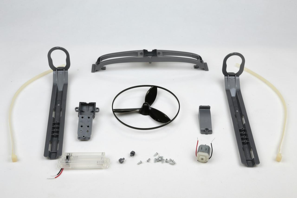 Батарейки вырабатывают электроэнергию для двигателя. Он в свою очередь заставляет пропеллер крутиться. Вращаясь, лопасти пропеллера толкают воздух назад. Обратите внимание, что лопасти расположены под углом.