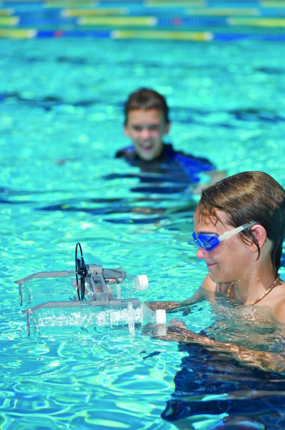 Все на борт! Путешествие начинается! «Суперкатамаран» – это набор 3 в 1, соединивший игру, обучение и проект по утилизации. В основе конструкции две пластиковые бутылки. Можно установить любые, которые найдутся в доме. Они как плавники удерживают катамаран на воде.