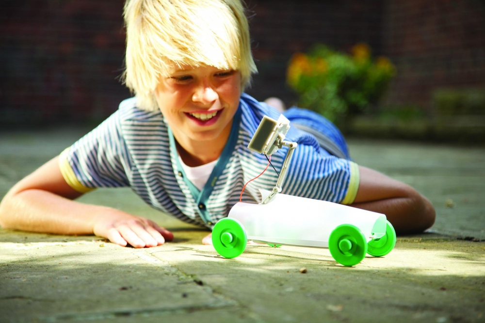 Попадая на фотоэлементы батареи, солнечный свет преобразуется в электрический ток. Полученная электроэнергия поступает в двигатель и заставляет червячное колесо вращаться. Движение передается на шестеренку, которая замедляет скорость вращения и позволяет мотору легче поворачивать колеса. Никаких чудес, просто физика.