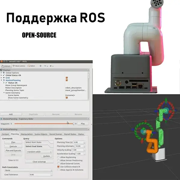 - Поддержка ROS, MoveIt, RViz, OpenCV;
