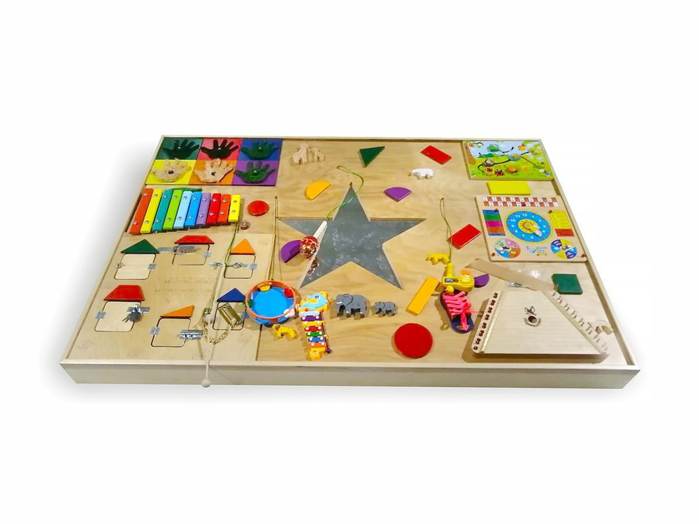 Доска сделана из прочной качественной фанеры, обработанной защитными пропитками. Острые края и углы сглажены для безопасности малышей. Игрушки на панели изготовлены из нетоксичных материалов и покрашены экологичными красками в приятные сочные цвета. В центре доски находится большая звезда из металла с фиброоптическими элементами.