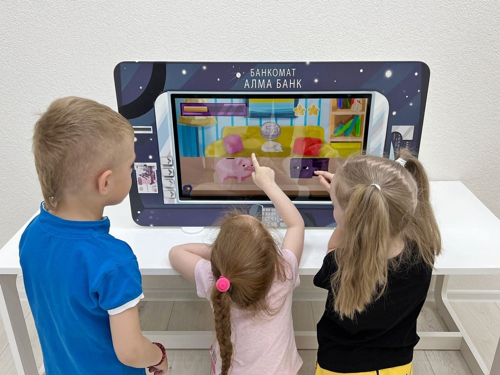 • Терминал АЛМА «Банк». Сенсорная панель с диагональю экрана 25 дюймов, поддержкой одновременной работы до 4 детей, тематическим оформлением в виде банкомата