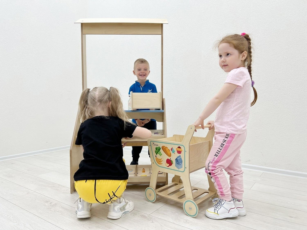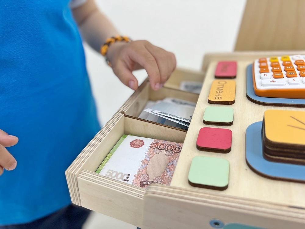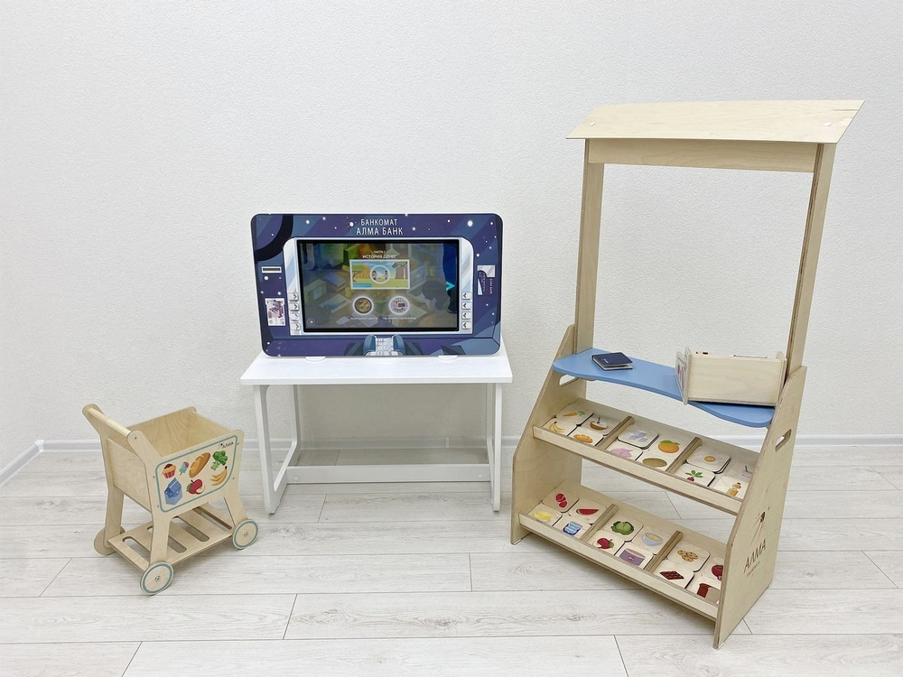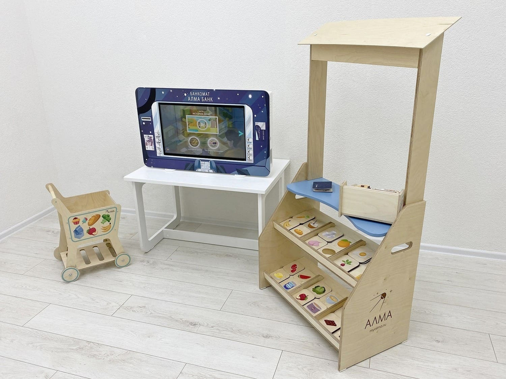 Помимо ПО, в комплекте есть реквизит для традиционных игр: детский киоск АЛМА «Магазин» с кассой, тележкой и продуктами. Макеты денег и пластиковых карт, копилки, кошельки, наборы для группового отыгрыша и усвоения навыков на практике