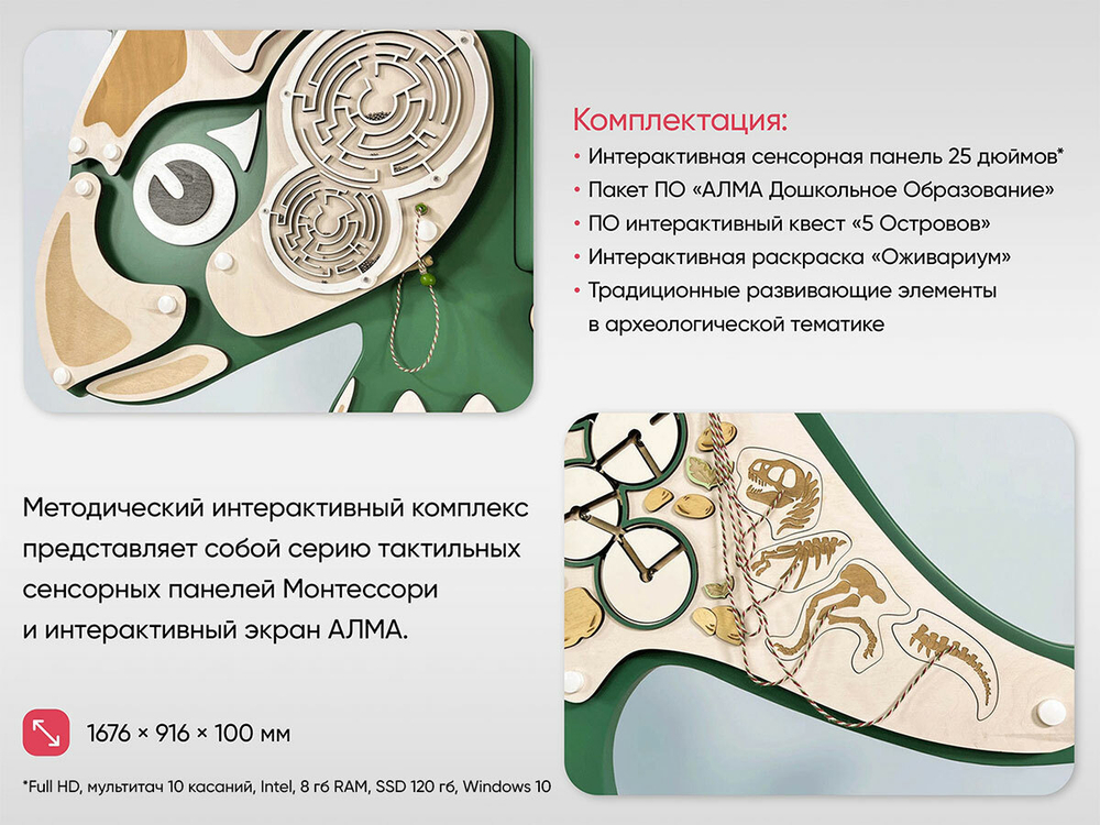На центральной части бизиборда находится интерактивная сенсорная панель, с комплектом лучших образовательных программ АЛМА. Более 200 интерактивных игр по дошкольной образовательной программе.