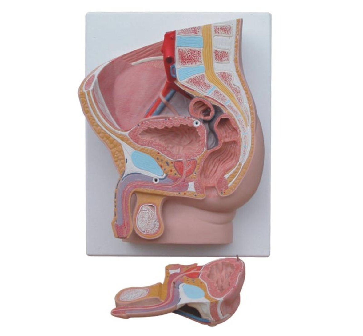 Анатомически точная модель мужского таза, выполненная в виде срединного сечения, которая идеально подходит для изучения строения мужской репродуктивной системы и сопутствующих органов.