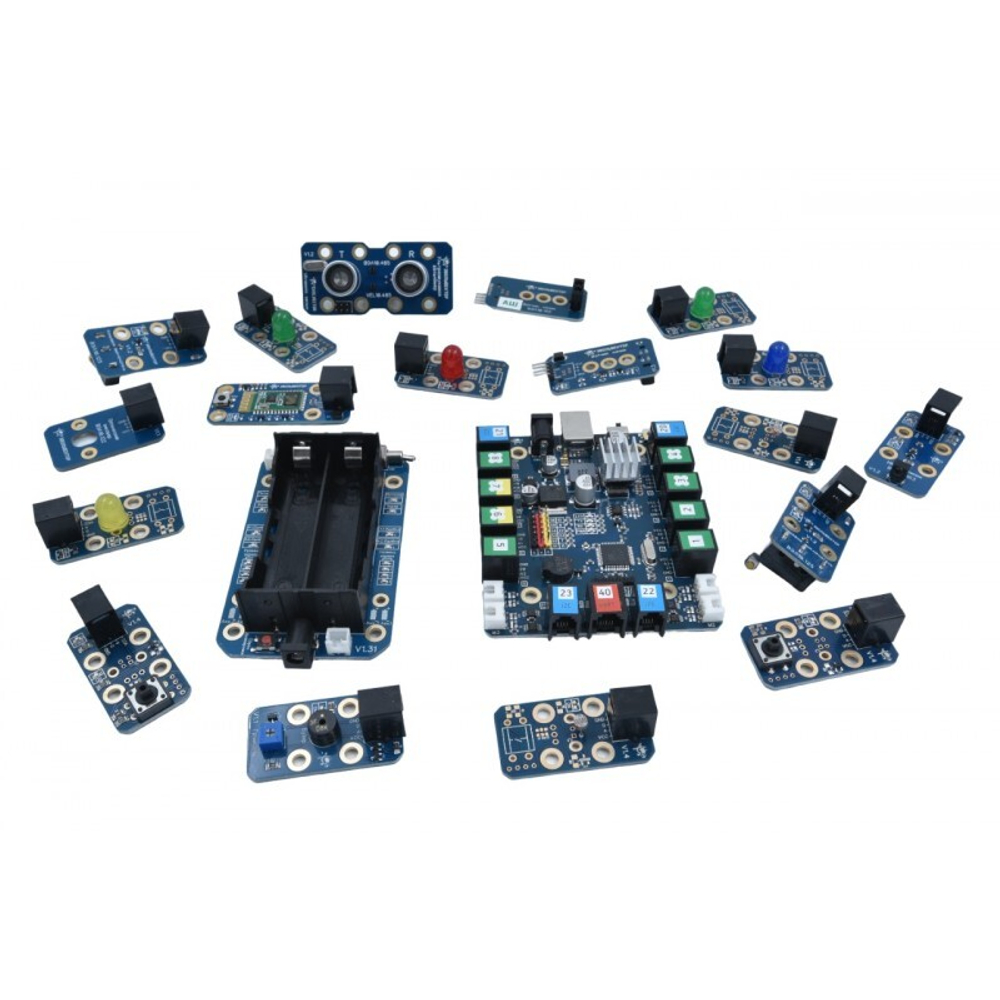 Набор электронных модулей с индикаторами и датчиками, в том числе ультразвуковыми, тактильными, контактными, оптическими, звуковыми и инфракрасными для модульного прототипирования управляющих систем робототехнических устройств.