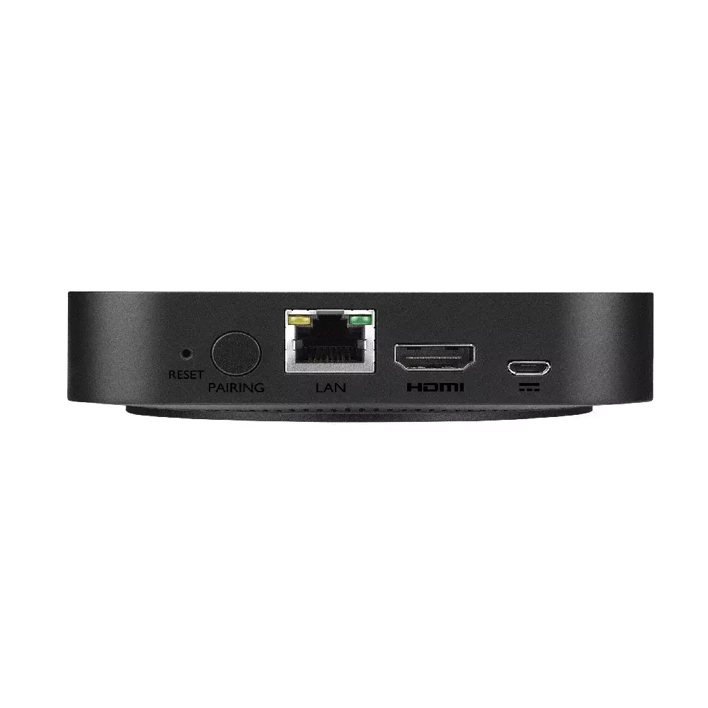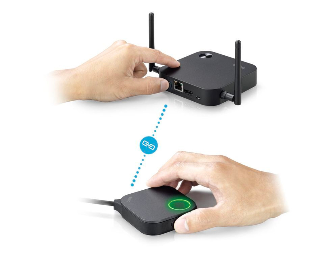 Сопряжение дополнительных кнопок InstaShow с устройством приема сигнала проходит так же просто. Для автоматического беспроводного соединения достаточно в течение пяти секунд удерживать нажатыми соответствующие кнопки на устройстве приема сигнала и на кнопке-передатчике. Если приемник подключен к установленному на потолке проектору или находится в другом труднодоступном месте, соединение можно активировать через веб-интерфейс.