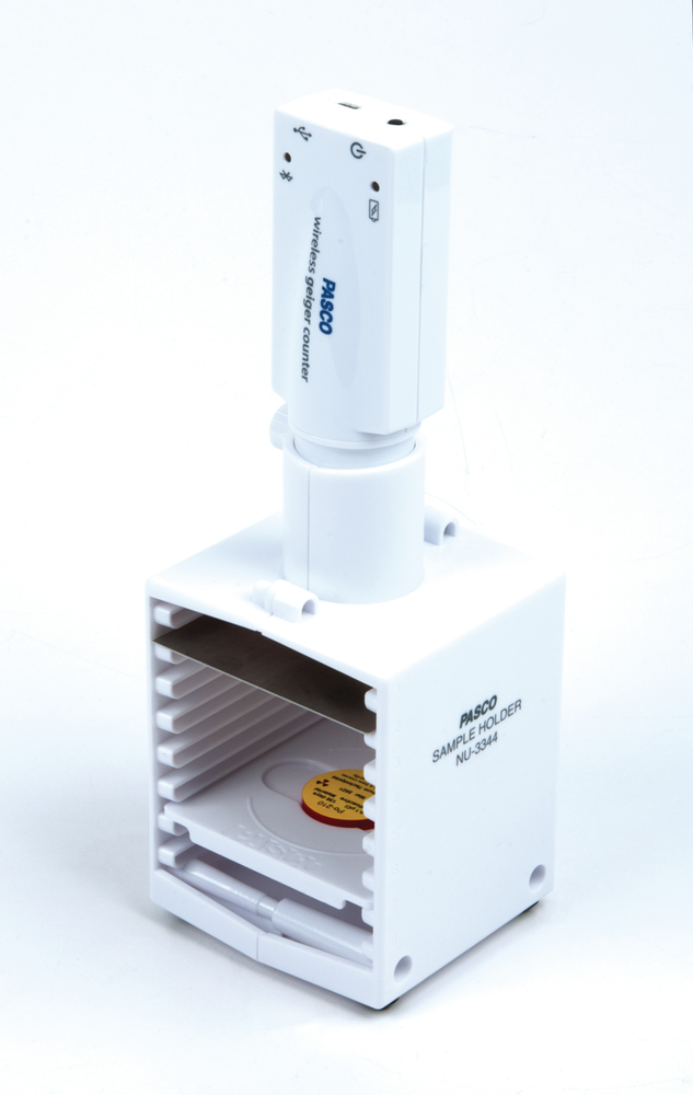 Беспроводной цифровой счётчик Гейгера PASCO подсчитывает частицы бета-, гамма- и альфа-излучения, когда они входят в детекторную трубку Гейгера-Мюллера внутри счётчика. Счётчик Гейгера обеспечивает превосходный контроль положения в лабораториях с законом обратных квадратов, а также звуковой сигнал, указывающий на обнаружение ионизирующего излучения. Передняя пластиковая накладка удобно помещается внутри стойки держателя образцов для счётчика Гейгера PASCO (NU-3344) (приобретается отдельно), которая стабилизирует переднюю часть детекторной трубки счётчика ровно в 1 см от первого паза в держателе.