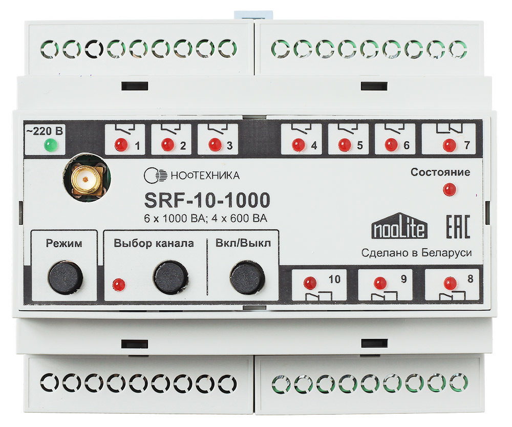 Силовой блок nooLite SRF-10-1000 имеет 6 выходов NO с максимальной нагрузкой до 1000 Вт на каждый канал и 4 NO/NC – по 600 Вт.