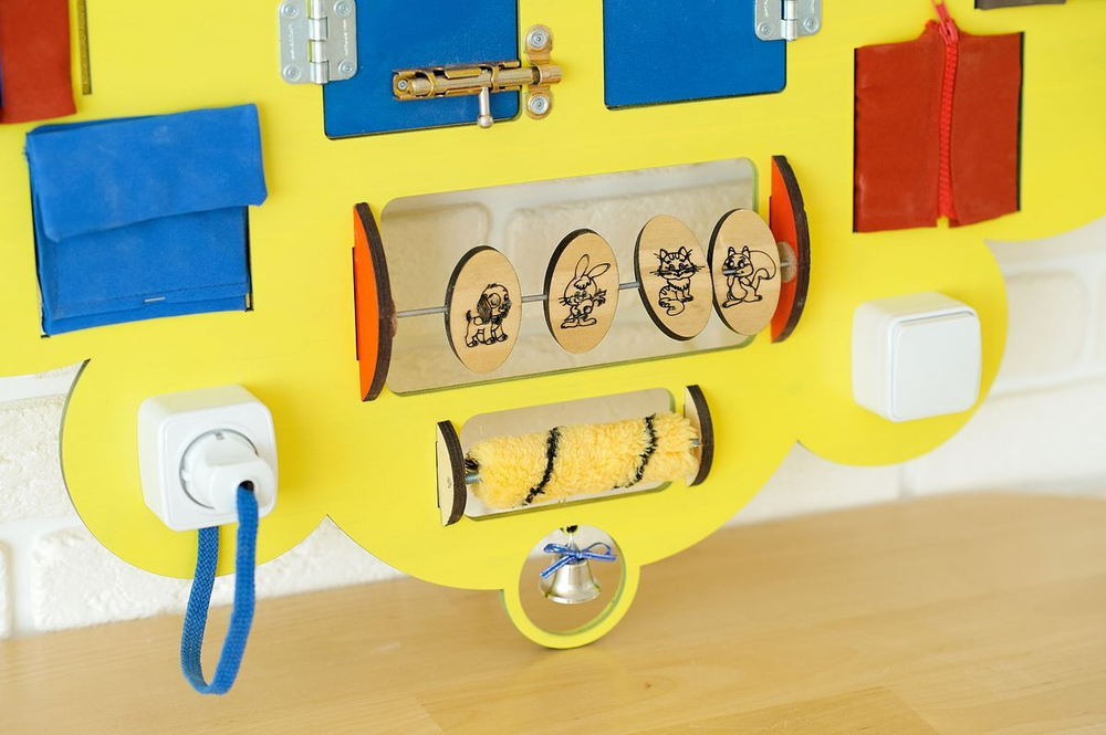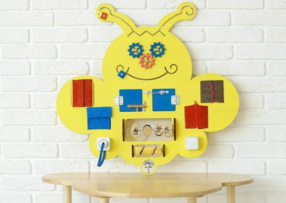 Бизиборд выполнен в виде яркой солнечной пчелки. Пчелка станет для малышей хорошим другом на пути развития. Дети не только физически и умственно развиваются, но и учатся самостоятельности в домашних делах. На панели расположены элементы, часто привлекающие детское внимание. Главный плюс – эффективное развитие и безопасное удовлетворение детского любопытства. Бизиборд предназначен для проведения развивающих игр в дошкольных образовательных учреждениях, коррекционных центрах и т.д.