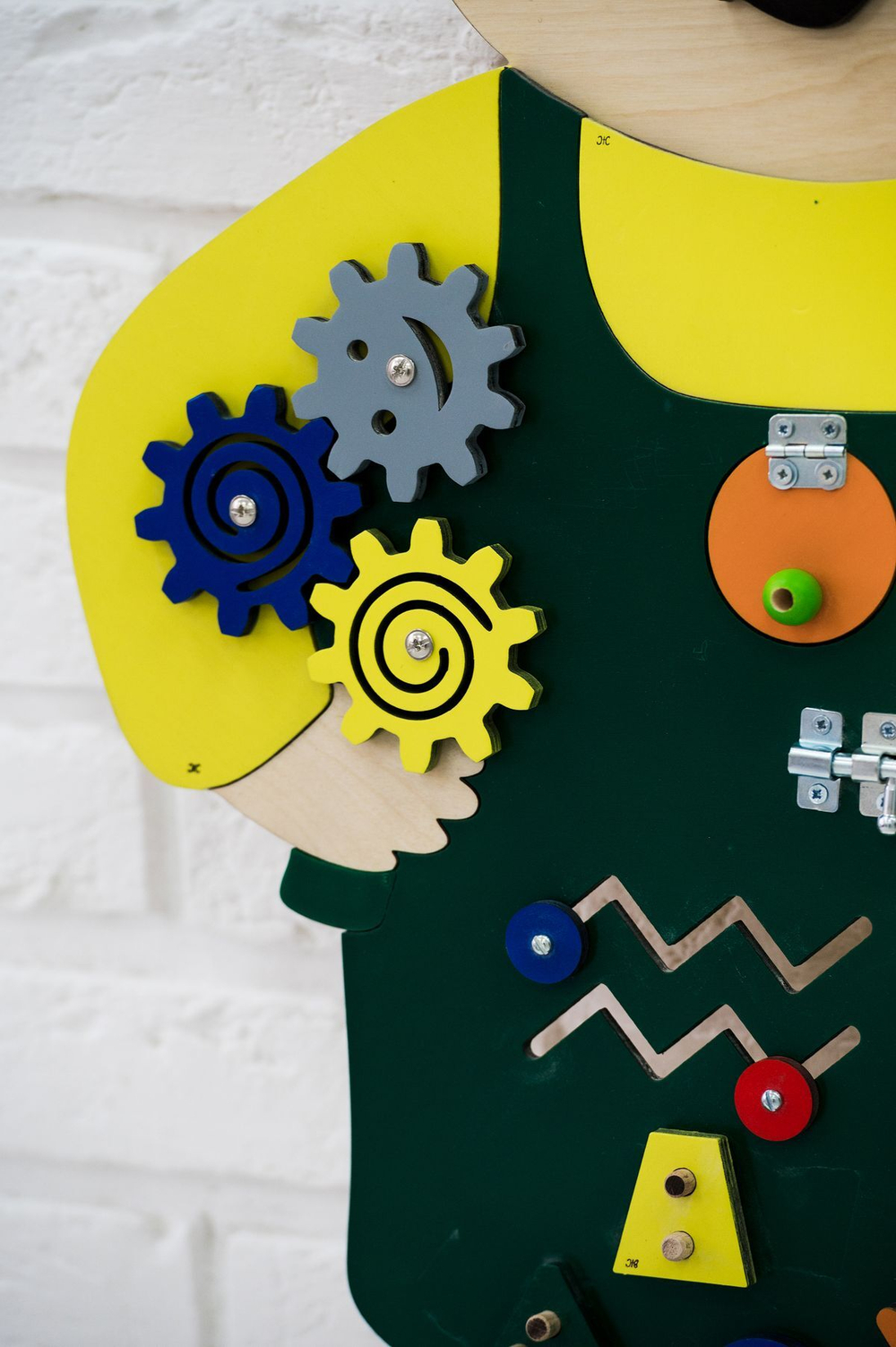 Материал бизиборда – обработанная и окрашенная фанера. Элементы выполнены из пластика, натурального окрашенного дерева и металла.