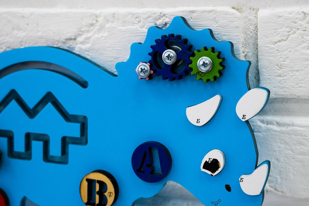 Бизиборд сделан в виде фантастического животного. Динозавры и драконы являются популярными и любимыми темами ребятишек. Детям стоит внимательнее рассмотреть каждую деталь «динозавра». Бизипанель выглядит ярко и стильно. Она привлекает внимание малышей и взрослых, делает уроки интереснее и позитивнее. Бизидоска богата разнообразием полезных элементов. Дети с легкостью придумают увлекательные сюжеты для игр.