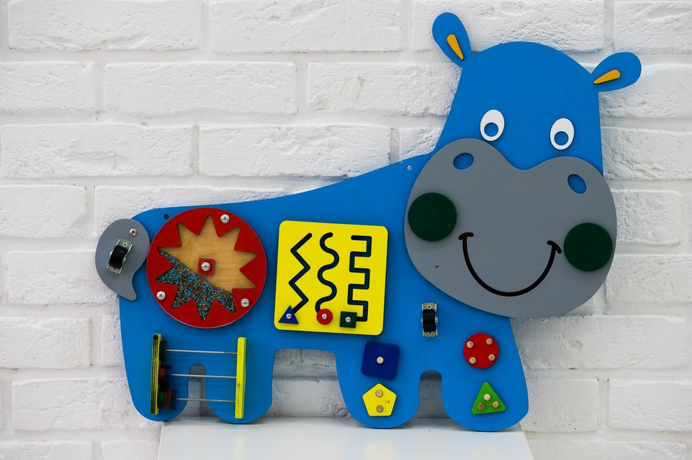 Бизиборд «Милый Бегемотик» можно использовать для занятий и развлечения с детьми от 1 года. Игрушка в форме бегемотика выполнена из качественной фанеры и окрашена в синий цвет. Все детали бизиборда безопасны для использования детьми, прочно закреплены.