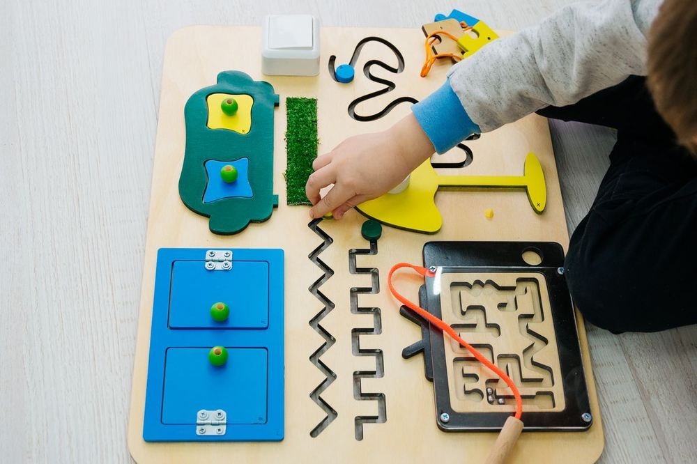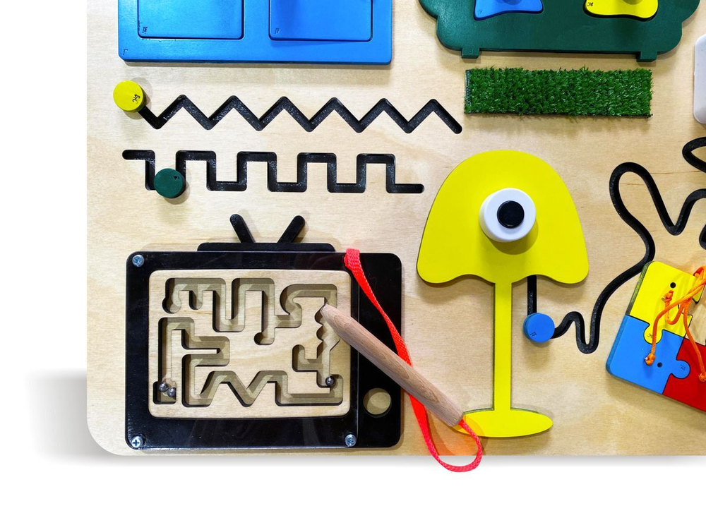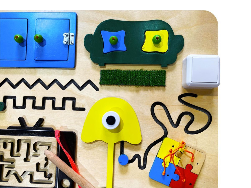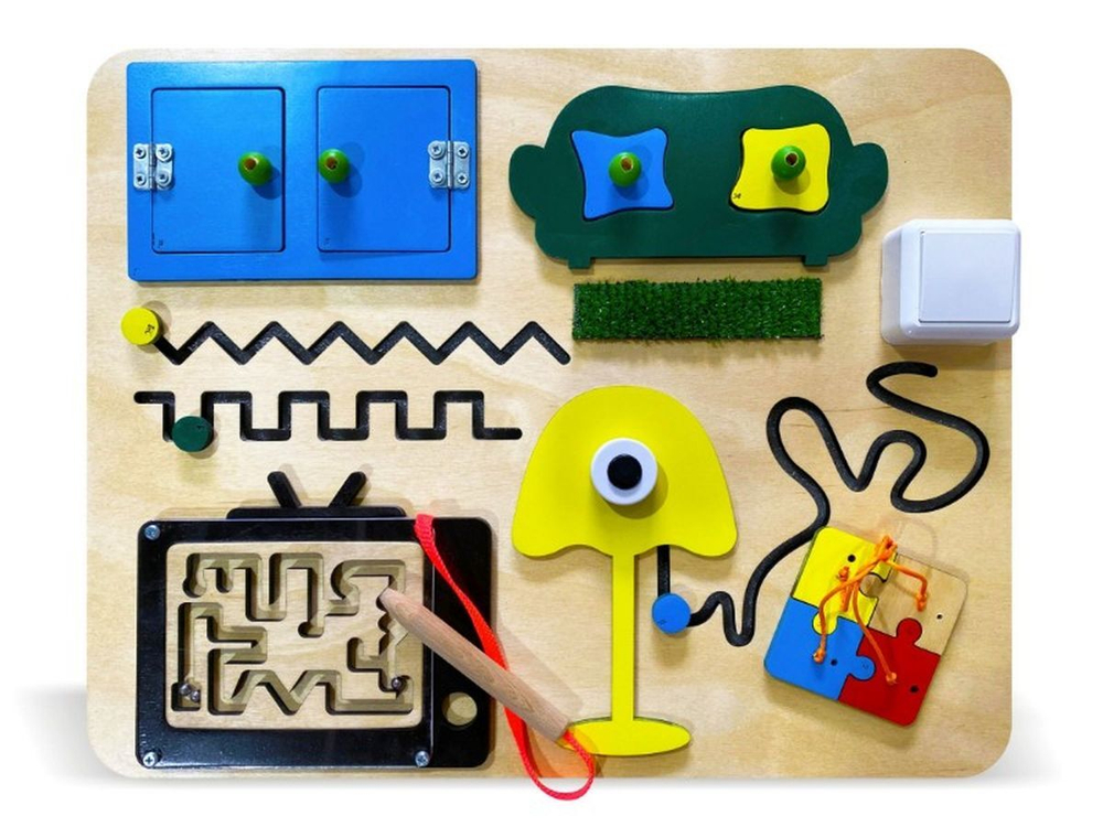Ключевой темой бизиборда стала гостиная комната. Панель напоминает собой небольшую комнатку теплого уютного дома. Во время игры детям предстоит окунуться в мир домашних дел, семьи. Что интересного ждет малышей во время игры? Ребята узнают, какую мебель ставят в гостиную, и испытают ее на прочность. Бизиборд богат разнообразием полезных элементов. Дети с легкостью придумают множество увлекательных сюжетов для игр с каждой деталью.