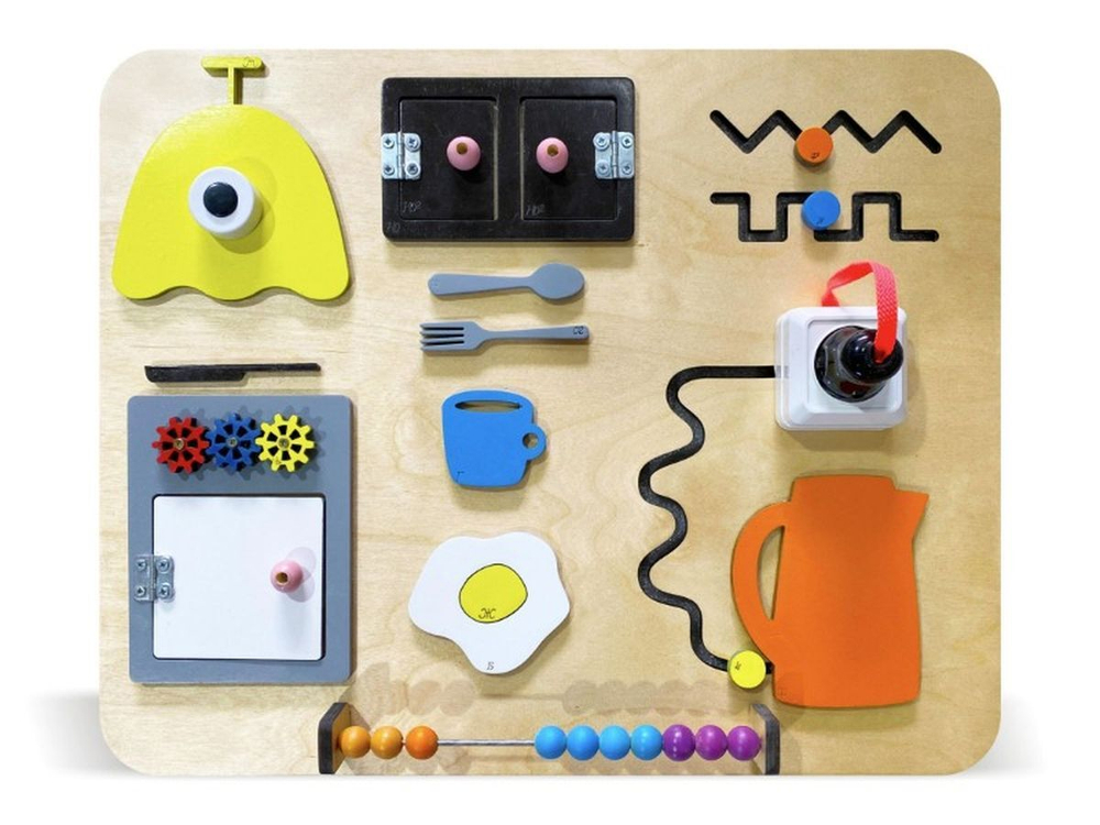 Ключевой темой бизиборда стала кухня. Панель напоминает собой небольшую комнатку уютного дома. Во время игры детям предстоит окунуться в мир домашних дел, семьи. Что интересного ждет малышей во время игры? Ребята узнают, какую мебель ставят на кухню, и испытают ее на прочность. Бизиборд богат разнообразием полезных элементов. Дети с легкостью придумают множество увлекательных сюжетов для игр с каждой деталью.