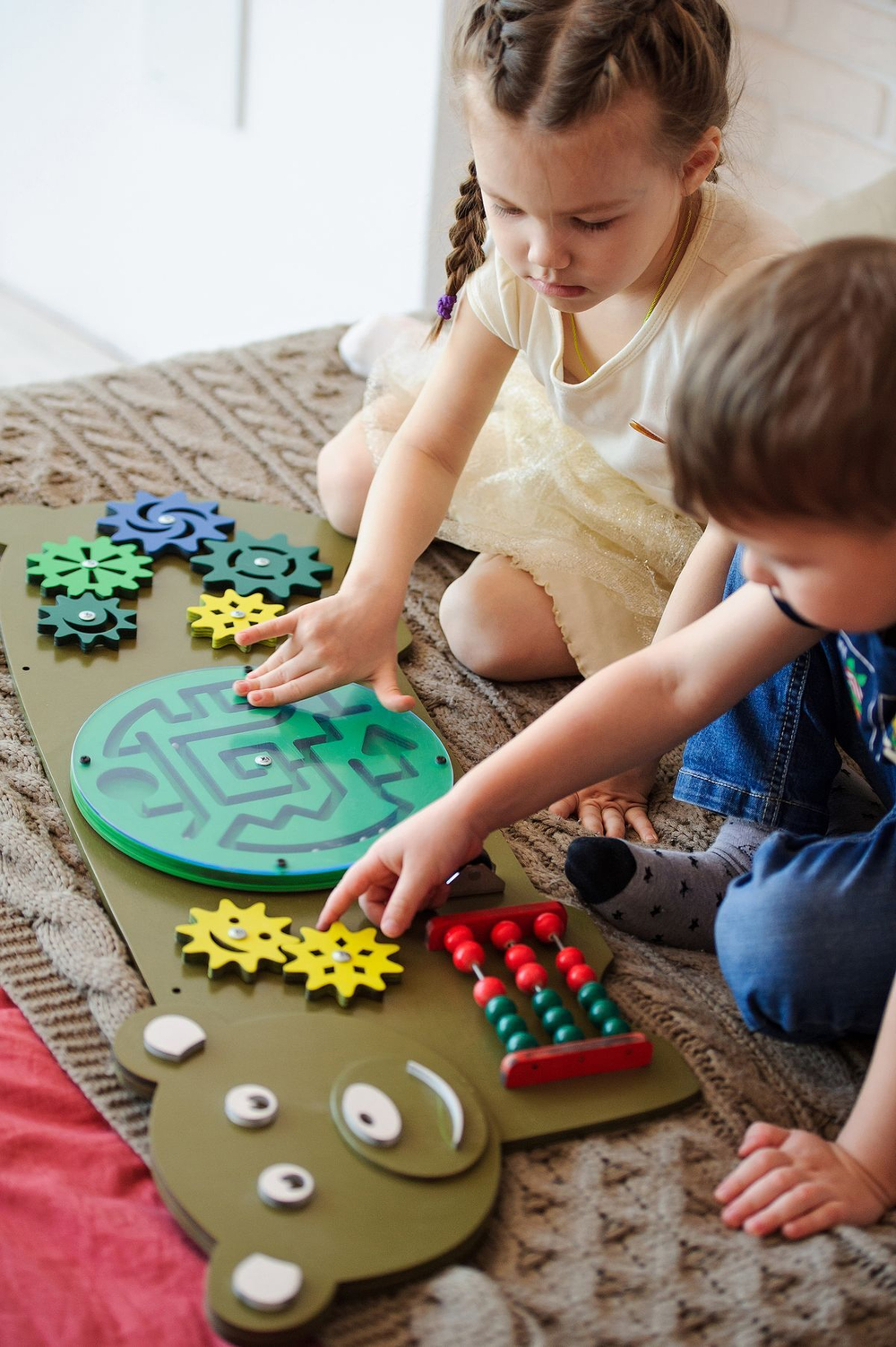 Бусины на стержне выступают в роли счетов и развивают начальные математические навыки. Малыш знакомится с цифрами и учится их сравнивать.