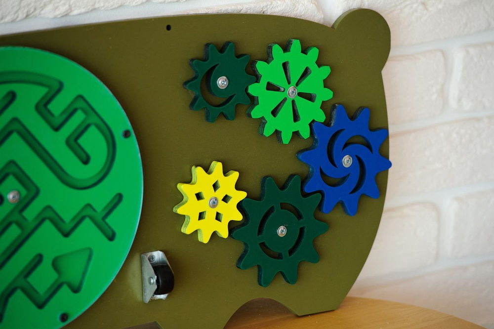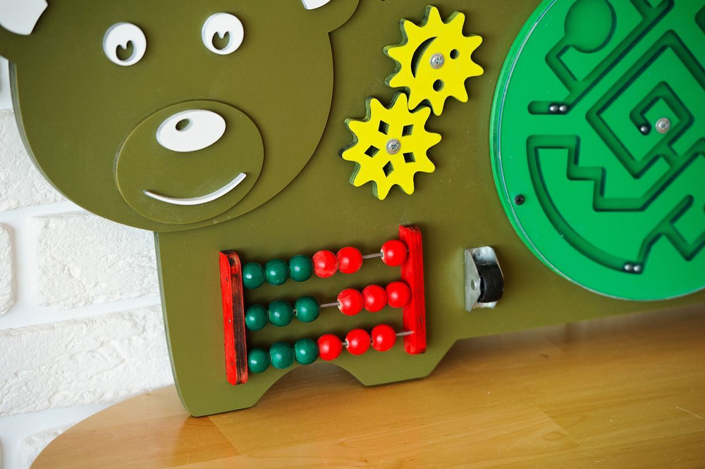 Бизиборд выполнен в виде смешного мишки. С таким милым медвежонком учиться и играть одно удовольствие. Дети не только физически и умственно развиваются, но и учатся самостоятельности в домашних делах. На панели расположены элементы, часто привлекающие детское внимание. Главный плюс – эффективное развитие и безопасное удовлетворение детского любопытства. Бизиборд предназначен для проведения развивающих игр в дошкольных образовательных учреждениях, коррекционных центрах и т.д.