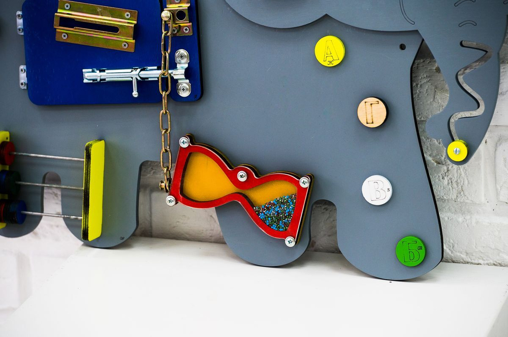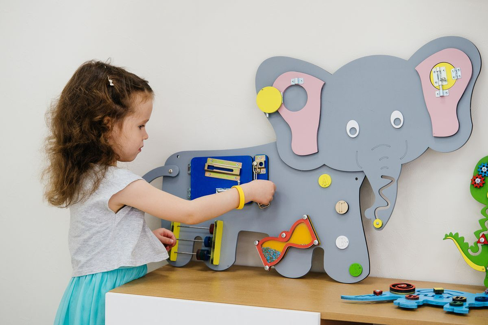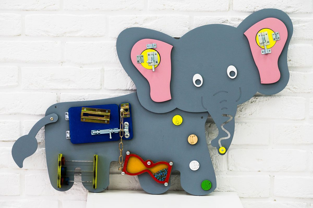 Бизиборд сделан в виде милого отважного слоненка. Играя, дети выполняют 7 разных заданий: вращение, открывание-раскрывание, волнообразное движение и другие. Каждое упражнение развивает и тренирует память, движение рук, логическое мышление и иные умения и навыки.