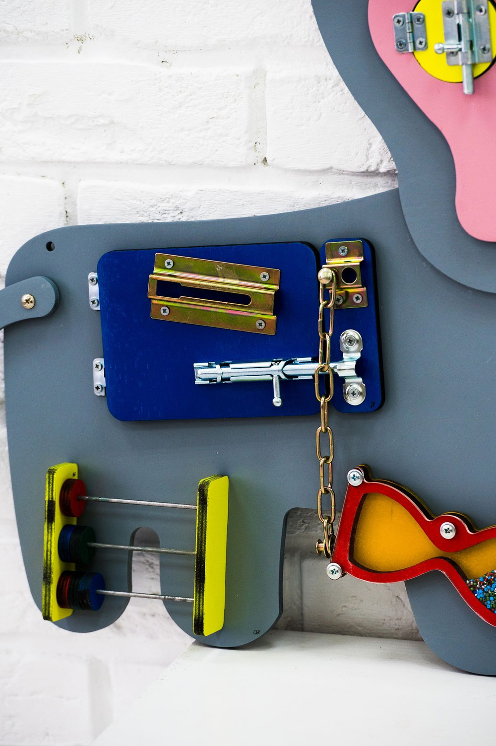 Слоненок выполнен из окрашенной фанеры. Все детали прочно закреплены. Использование бизиборда рекомендовано дома, в детских садах, развивающих и развлекательных центрах.