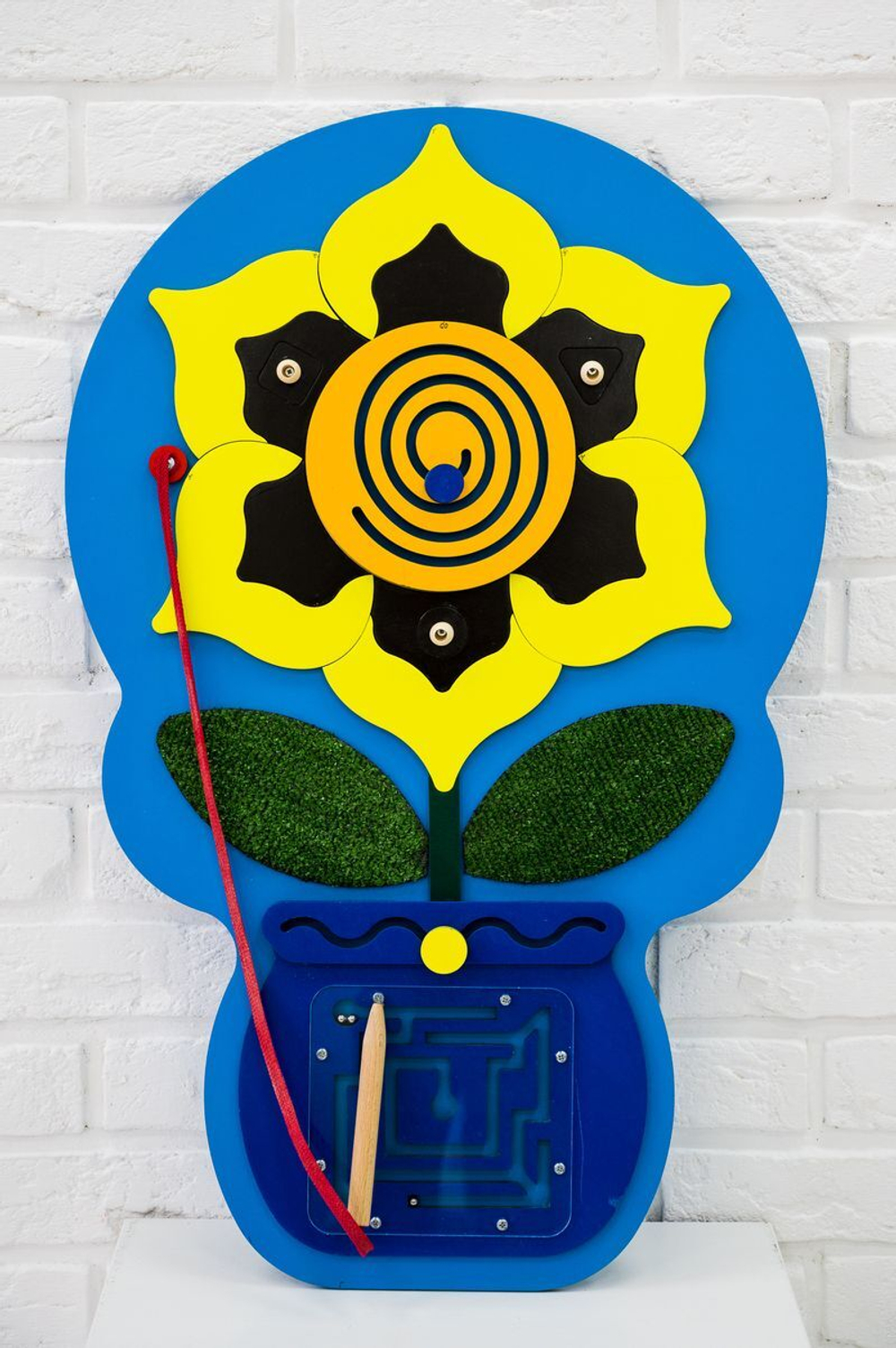 Бизиборд выполнен в виде красочного подсолнуха. Панель придает приятное летнее настроение. Дети не только физически и умственно развиваются, но и учатся самостоятельности в домашних делах. На панели расположены элементы, часто привлекающие детское внимание. Главный плюс – эффективное развитие и безопасное удовлетворение детского любопытства. Бизиборд предназначен для проведения развивающих игр в дошкольных образовательных учреждениях, коррекционных центрах и т.д.