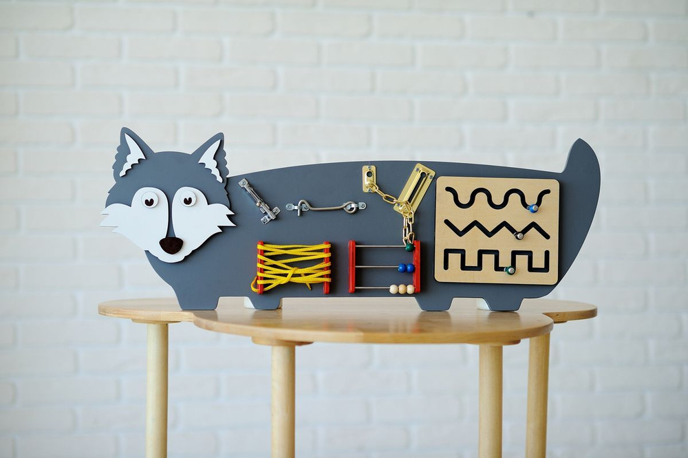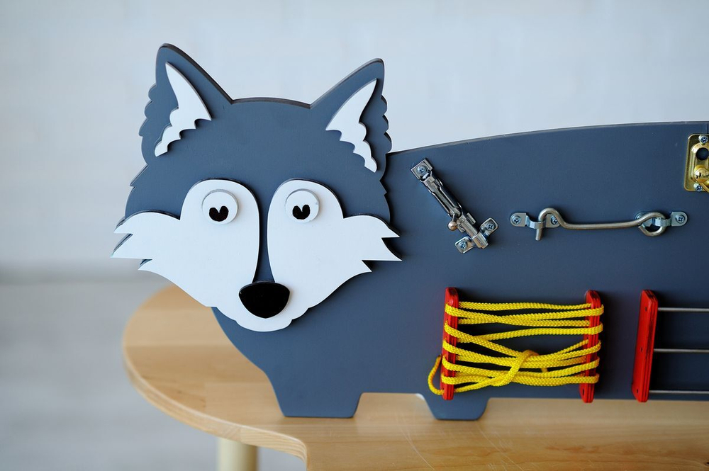 Бизиборд в тематике жизни диких животных будет интересен многим детям. Дикий мир таит в себе множество тайн и загадок природы. Детям стоит внимательнее рассмотреть каждую деталь «волка». Бизипанель выглядит ярко и стильно. Она привлекает внимание малышей и взрослых, делает уроки интереснее и позитивнее. Бизидоска богата разнообразием полезных элементов. Дети с легкостью придумают увлекательные сюжеты для игр.