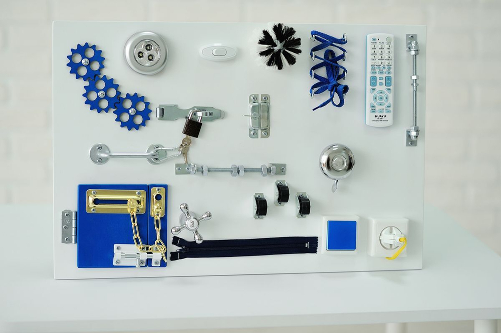 Бизиборд в стильном бело-синем цвете предназначен для маленьких мастеров. Каждый мальчик сможет испытать тот или иной элемент, изучить принцип его действия и строение. Дети не только физически и умственно развиваются, но и учатся самостоятельности в домашних делах. На панели расположены элементы, часто привлекающие детское внимание. Главный плюс – эффективное развитие и безопасное удовлетворение детского любопытства. Бизиборд предназначен для проведения развивающих игр в дошкольных образовательных учреждениях, коррекционных центрах и т.д.