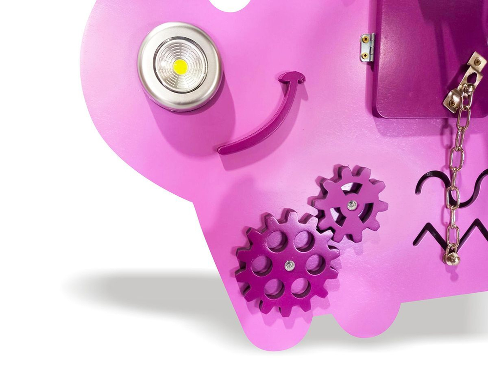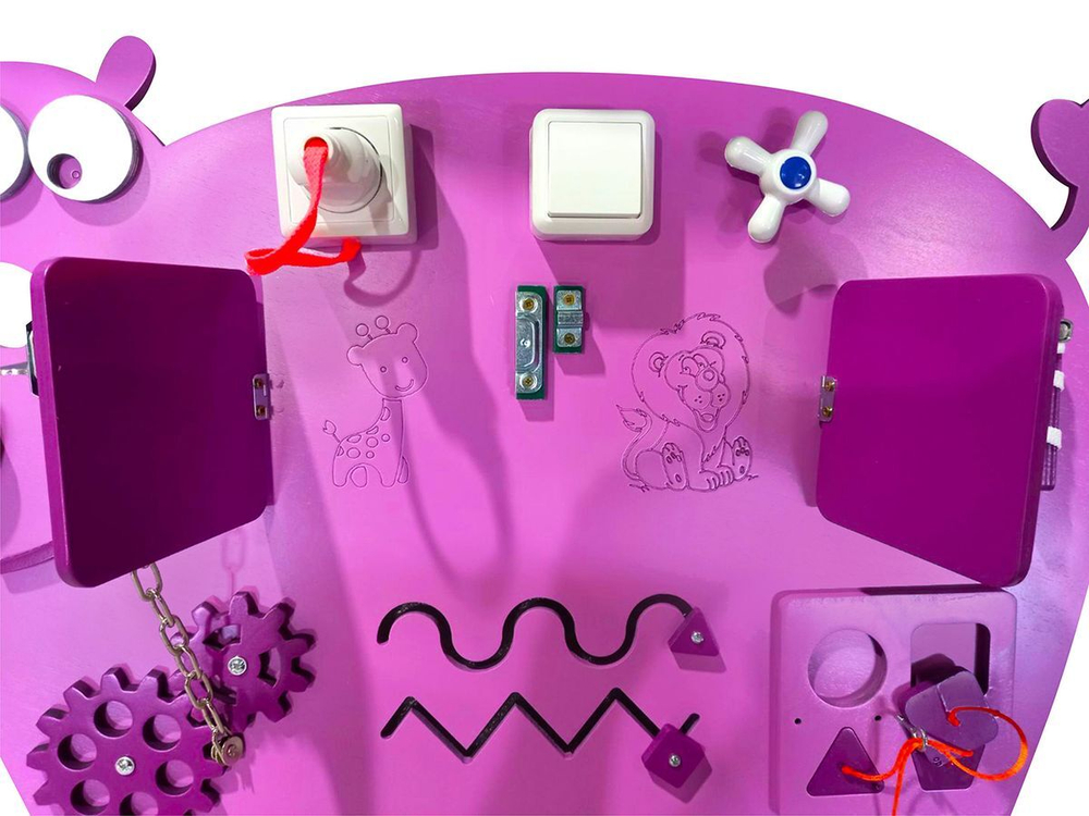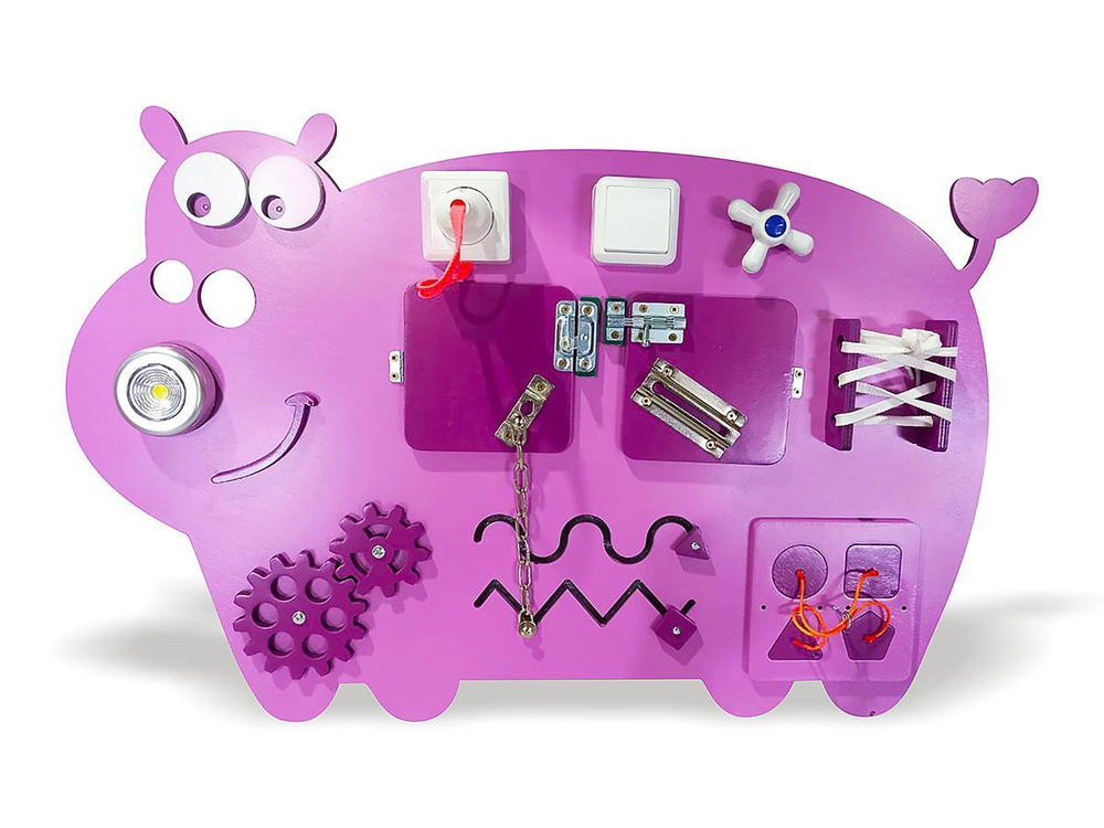 Улыбающийся бегемот с первого взгляда цепляет внимание малышей и дарит хорошее настроение. На бизиборде расположены многочисленные элементы, помогающие приобрести бытовые навыки, без которых сложно представить дальнейшую жизнь. Играя с бизибордом, малыши тренирую координацию и внимательность, развивают пространственное мышление и логику, а также укрепляют мышцы кистей рук и учатся незаметно для себя. Бизиборд подходит для развивающих игр в детских садах и домашних условиях.