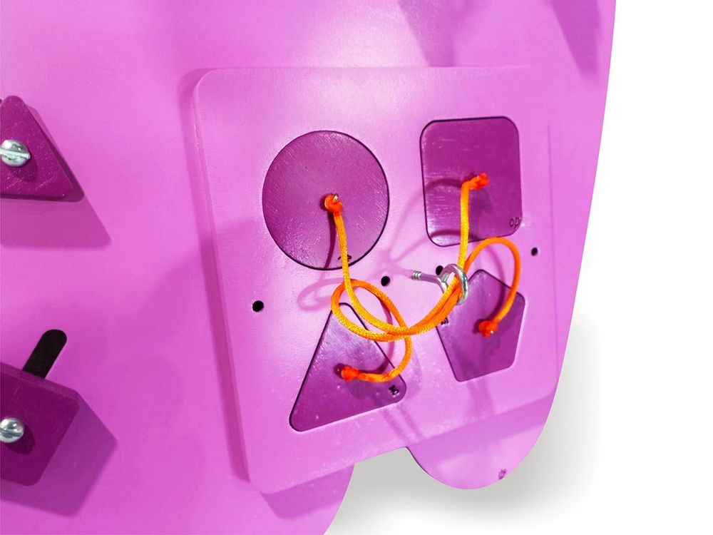 Панель с вкладышами на задних лапах стимулирует визуальное и тактильное восприятие, когда ребенок, ориентируясь на форму контура, ищет подходящую деталь. Также тренажер полезен для развития координации, потому что углы вкладышей позволяют вставлять их на место только в определенном положении;