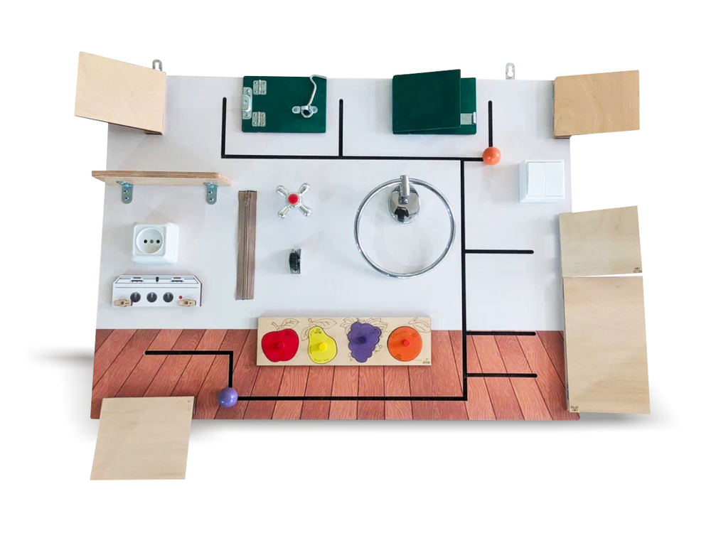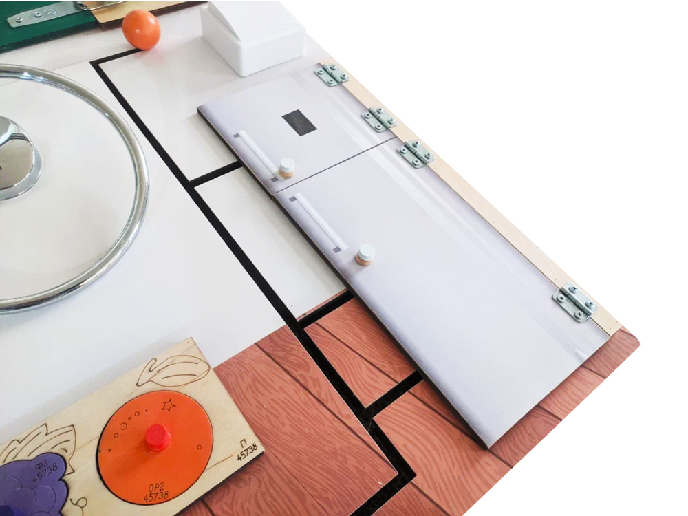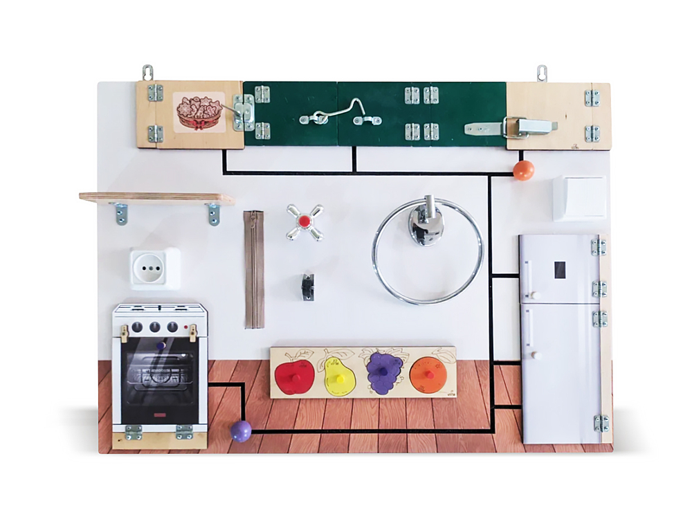 Бизиборд имеет реалистичные макеты кухонной мебели и техники, электроприборов и предметов гигиены. Это можно использовать для веселой ролевой игры, в ходе которой малыш с интересом освоит все навыки. Кроме этого, бизиборд ориентирован на развитие моторики, логики, всех видов памяти и восприятия. Для крепления предусмотрено две прочные петли, которые позволяют органично разместить бизиборд на стене, делая его гармоничным украшением для любого интерьера. Отсутствие острых углов и выступов исключает риск случайных травм.