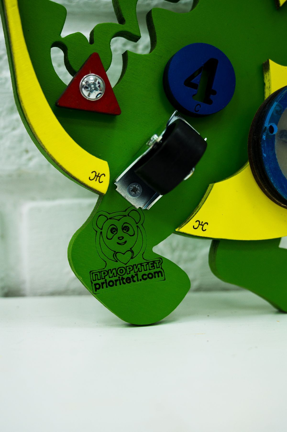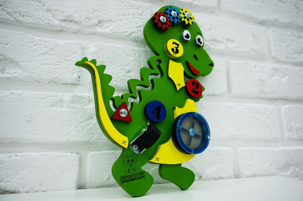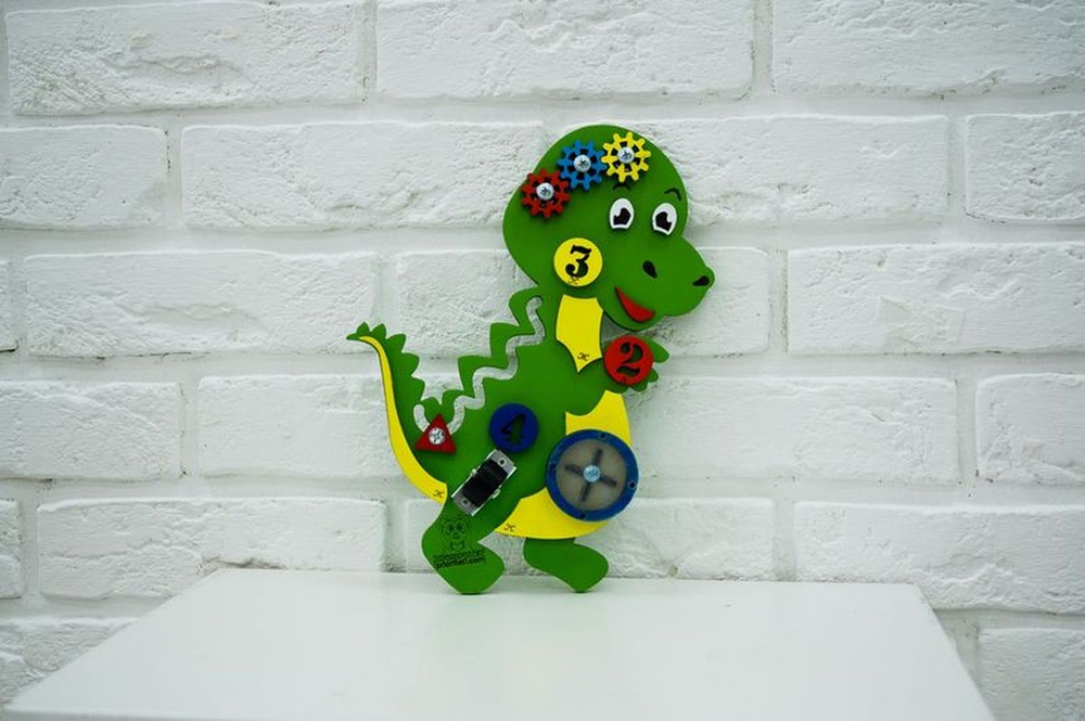 Бизиборд с изображением милого динозаврика вызовет массу приятных эмоций. Ребенку захочется поделиться своим восторгом с взрослым и сверстниками – этому не надо препятствовать. Наиболее подходящий возраст: от одного года до семи лет. Данный период является наиболее сенситивным для становления и развития личности.