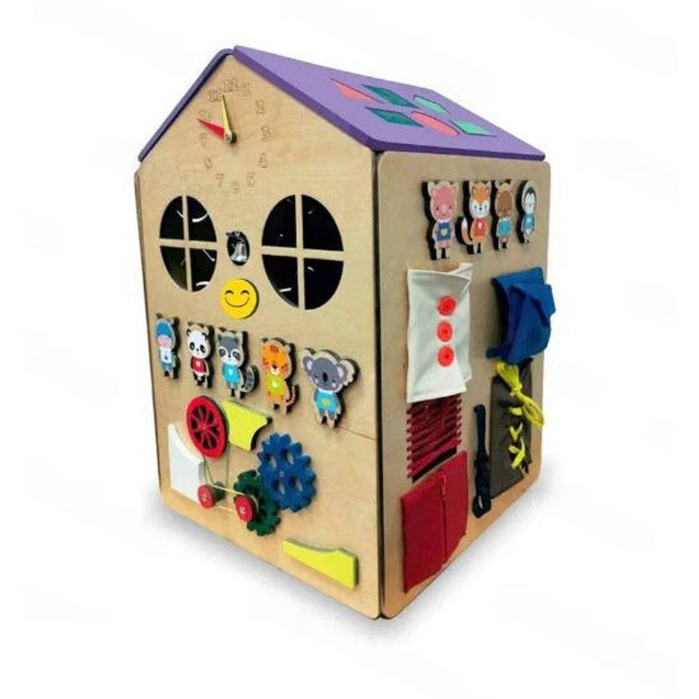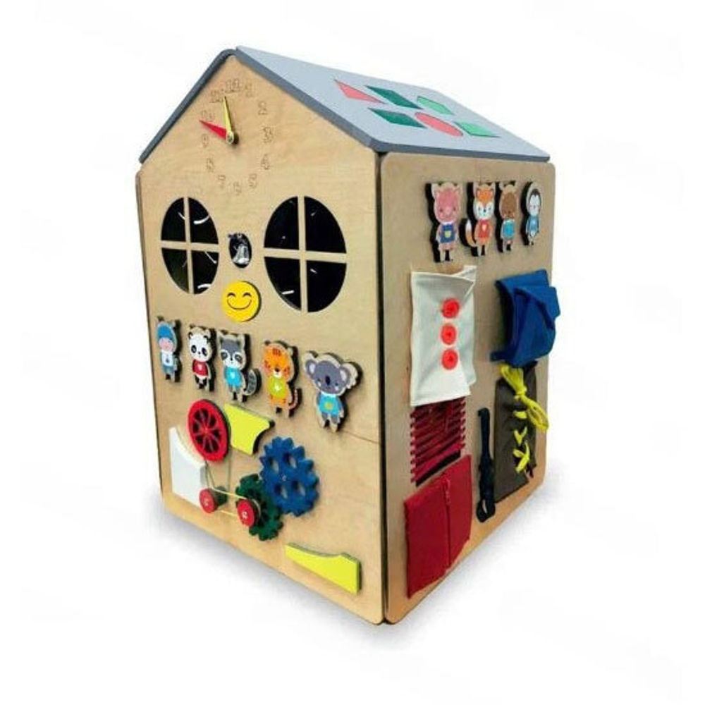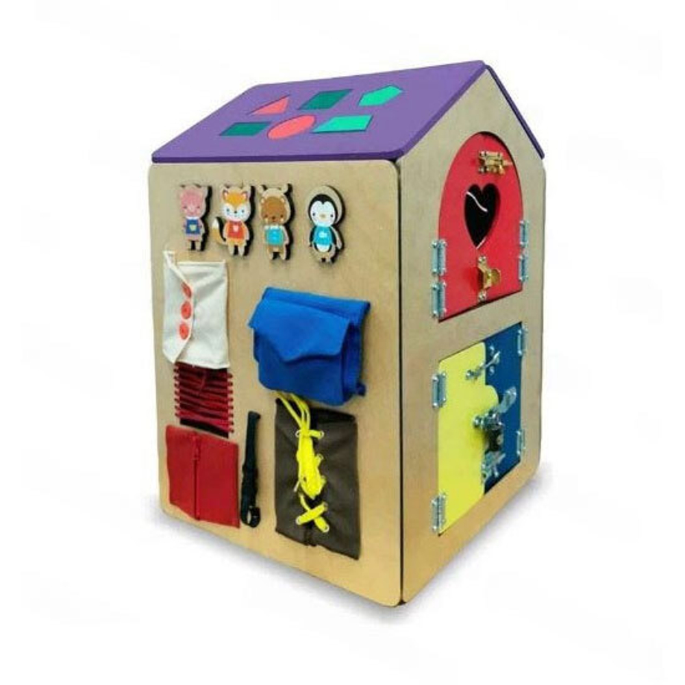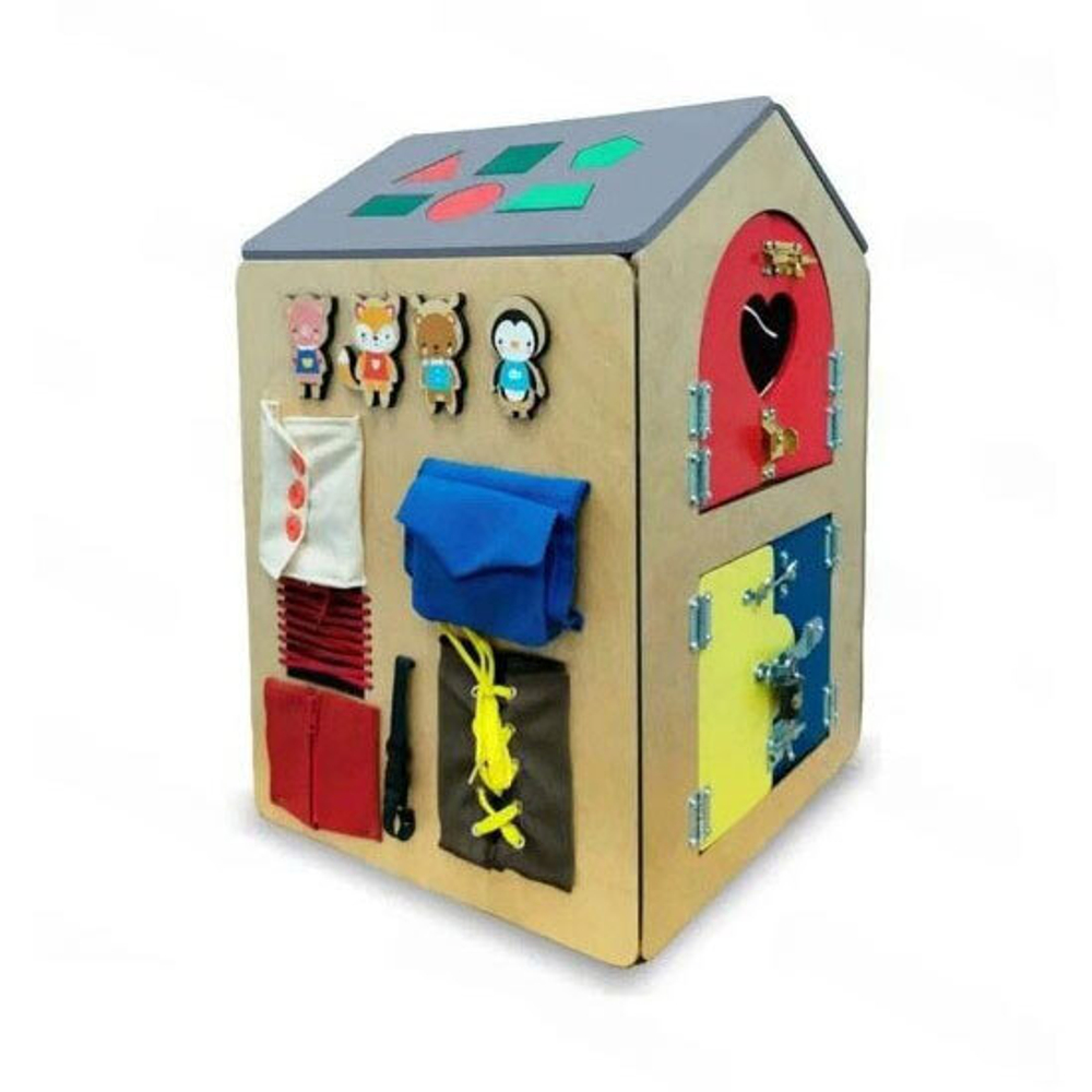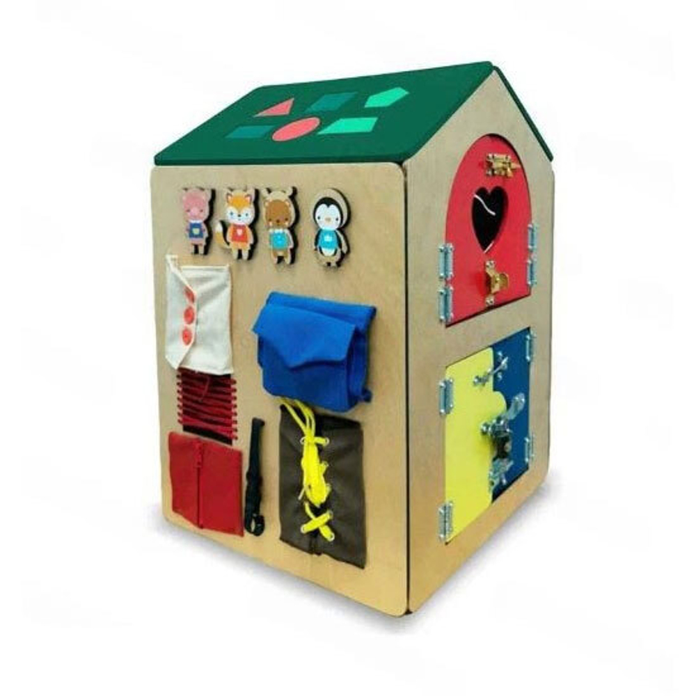 Бизидомик имеет сертификацию по ФГОС. Изготовлено изделие из прочной и износостойкой фанеры. Она имеет стойкость к коррозии, на ней не скапливается плесень, если в помещении влажно. У конструкции отсутствуют острые углы и элементы, которые навредили бы малышу во время игры. Ярко зеленая крыша и интересное оформление домика позволят ребенку не отвлекаться на посторонние вещи. Ребенку захочется поиграть с бизидомиком. Идеальная игрушка для проведения досуга в любое свободное время.
