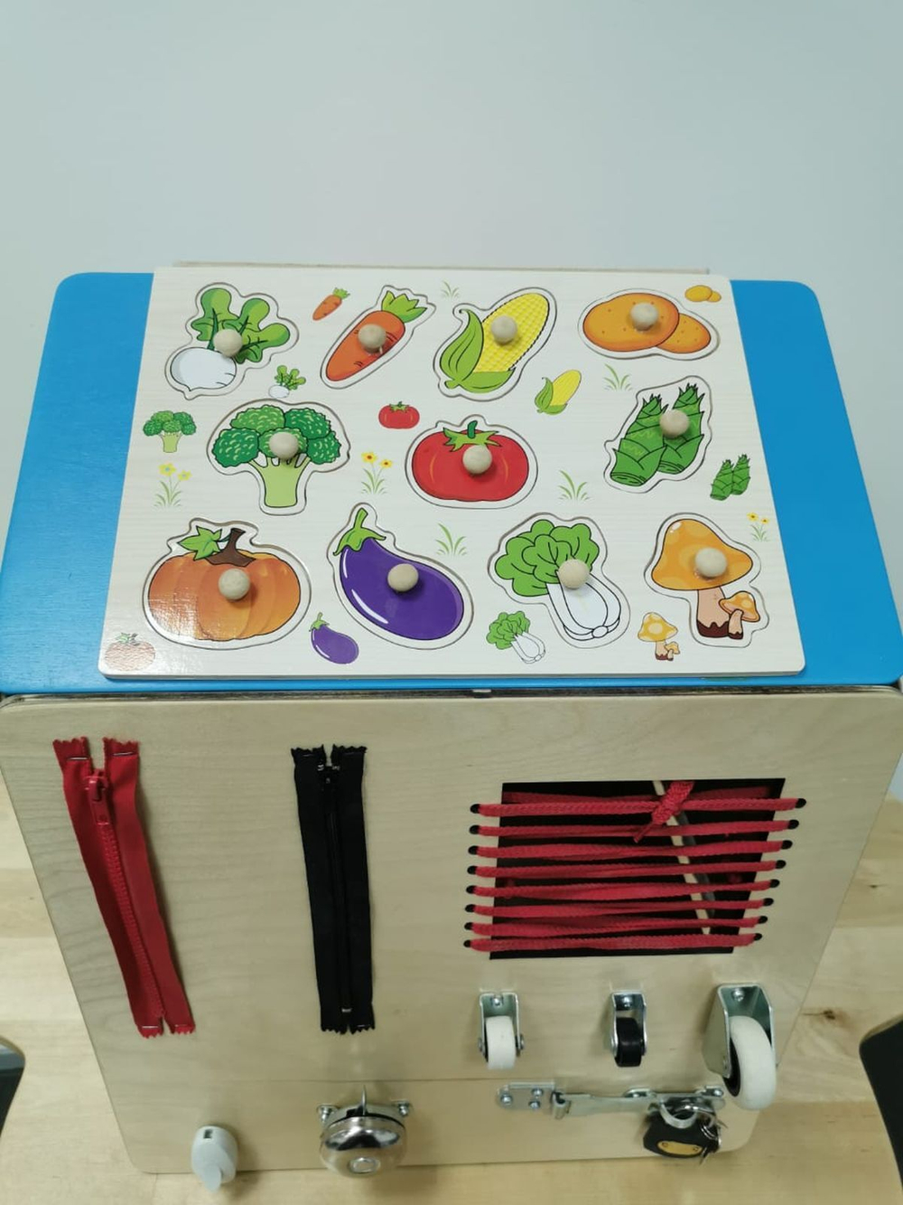 Бизидом с паровозиком «Бабушкин помощник» состоит из шести панелей, которые прочно соединены между собой. Каждая панель содержит большое количество разнообразных элементов и предметов, которые нацелены на развитие у детей базовых повседневных навыков и безопасное удовлетворение детского любопытства.