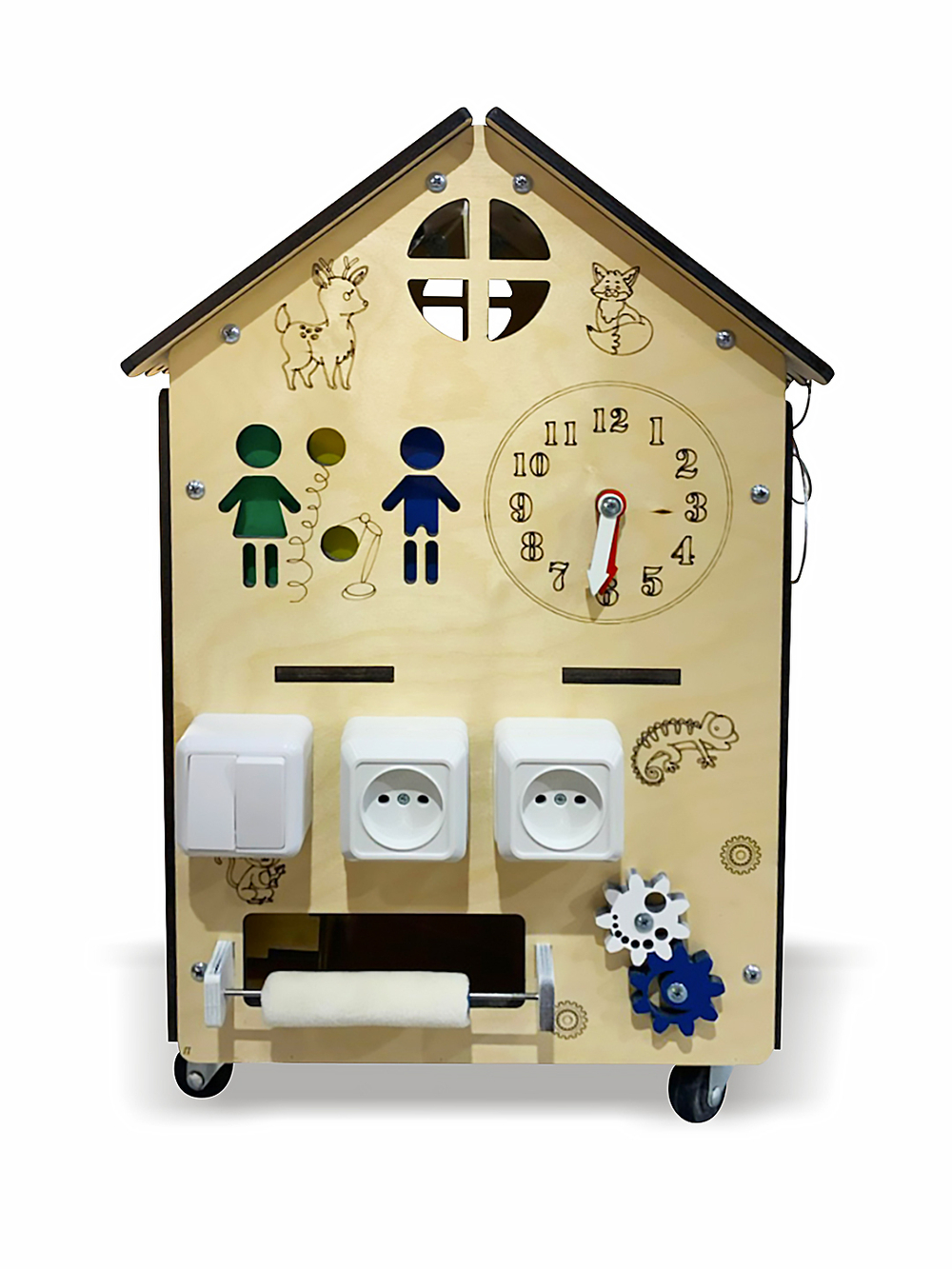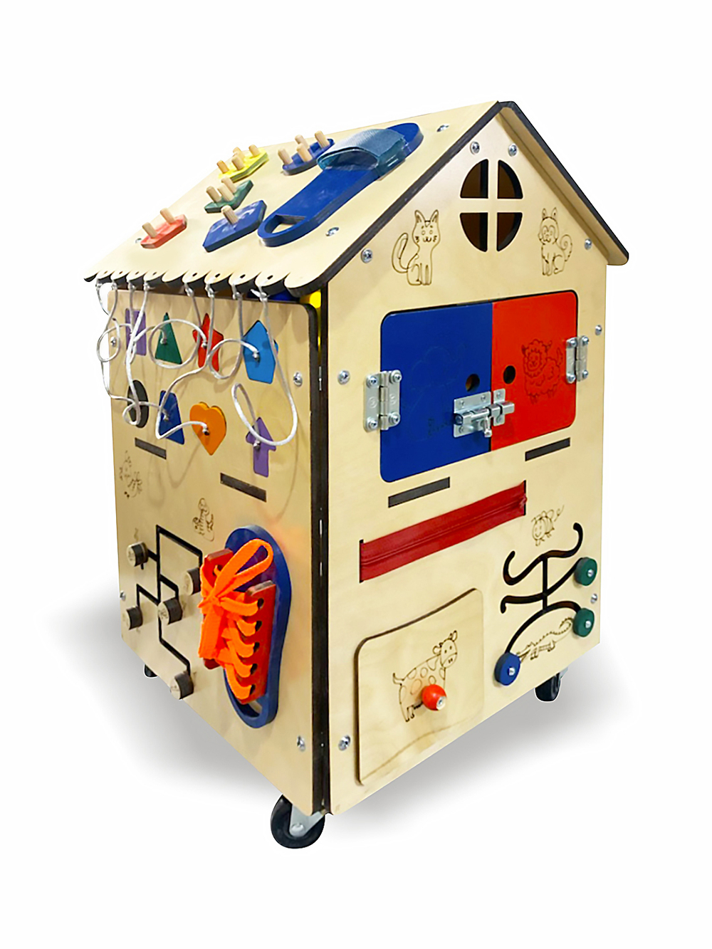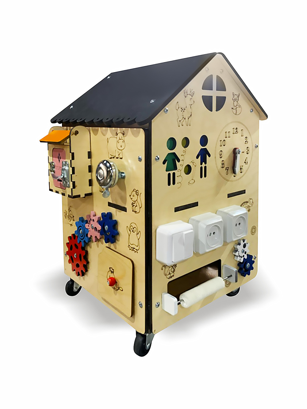 На бизидоме закрепляют макеты предметов, взаимодействие с которыми в обычной действительности опасно или невозможно. Это могут быть выключатели, дверные задвижки, фонарики, розетки, шнуры. На домике расположены предметы для развития мелкой моторики пальчиков малыша. На панели можно наносить рисунок или раскрашивать заготовки. Широко применяется в дошкольных учреждениях в соответствии с ФГОС. Можно использовать в семейном воспитании малышей от 1 года до 7 лет.